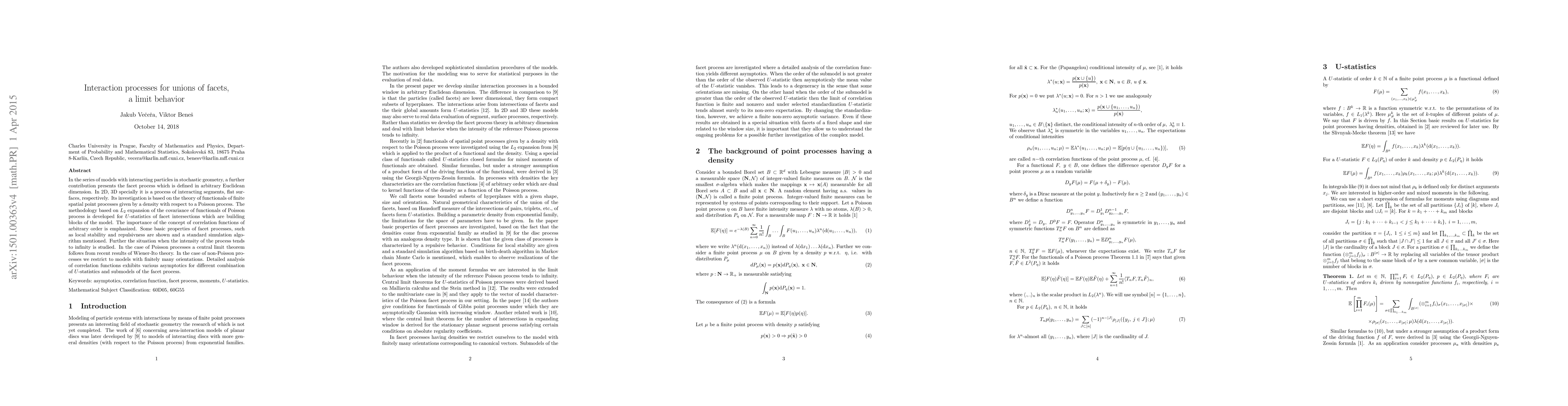 In the series of models with interacting particles in stochastic geometry, a new contribution presents the facet process which is defined in arbitrary Euclidean dimension. In 2D, 3D specially it is a process of interacting segments, flat surfaces, respectively. Its investigation is based on the theory of functionals of finite spatial point processes given by a density with respect to a Poisson process. The methodology based on L2 expansion of the covariance of functionals of Poisson process is developed for U-statistics of facet intersections which are building blocks of the model. The importance of the concept of correlation functions of arbitrary order is emphasized. Some basic properties of facet processes, such as local stability and repulsivness are shown and a standard simulation algorithm mentioned. Further the situation when the intensity of the process tends to infinity is studied. In the case of Poisson processes a central limit theorem follows from recent results of Wiener-Ito theory. In the case of non-Poisson processes we restrict to models with finitely many orientations. Detailed analysis of correlation functions exhibits various asymptotics for different combination of U-statistics and submodels of the facet process.