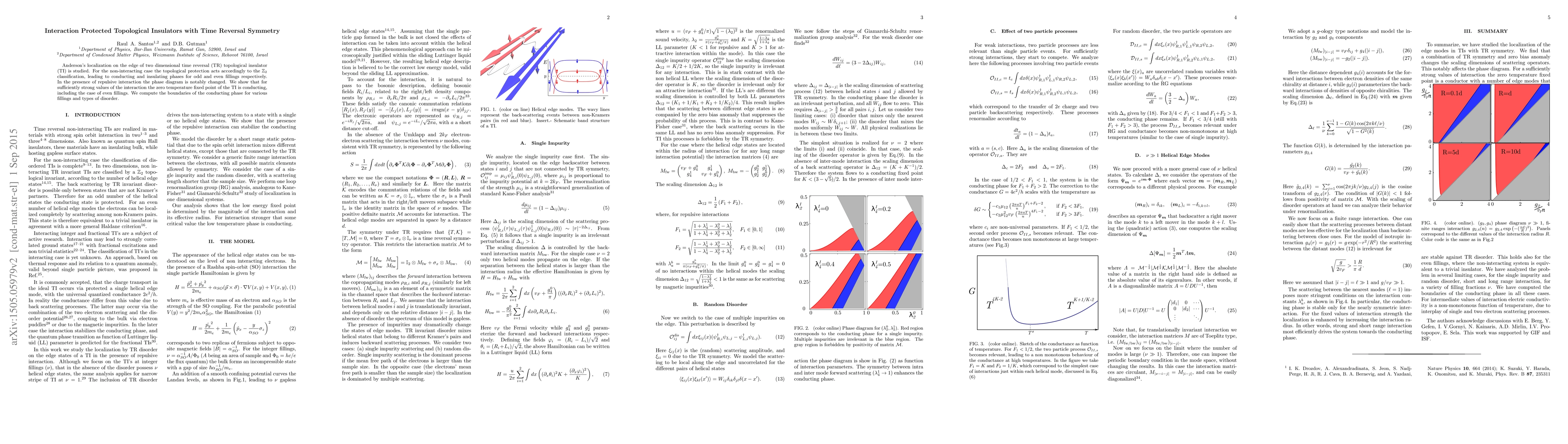 Anderson's localization on the edge of two dimensional time reversal (TR) topological insulator (TI) is studied. For the non-interacting case the topological protection acts accordingly to the $\mathbb{Z}_2$ classification, leading to conducting and insulating phases for odd and even fillings respectively. In the presence of repulsive interaction the phase diagram is notably changed. We show that for sufficiently strong values of the interaction the zero temperature fixed point of the TI is conducting, including the case of even fillings. We compute the boundaries of the conducting phase for various fillings and types of disorder.