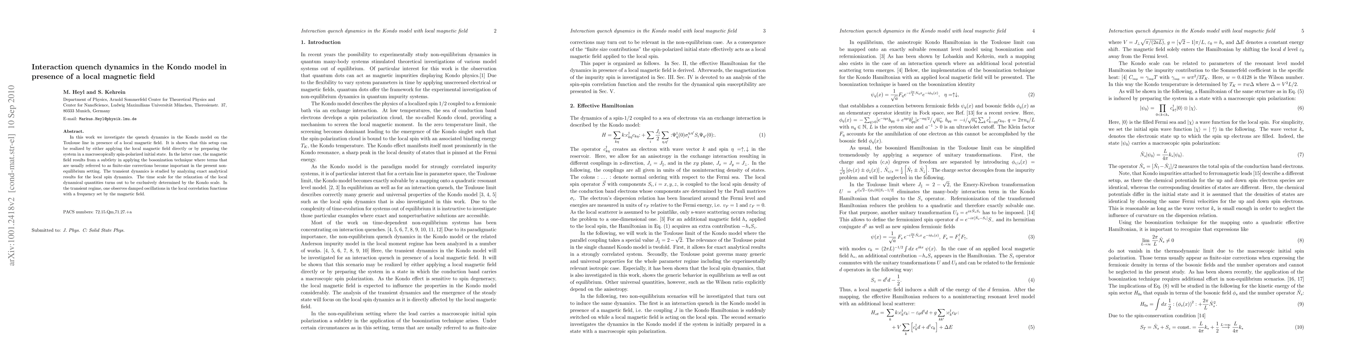 In this work we investigate the quench dynamics in the Kondo model on the Toulouse line in presence of a local magnetic field. It is shown that this setup can be realized by either applying the local magnetic field directly or by preparing the system in a macroscopically spin-polarized initial state. In the latter case, the magnetic field results from a subtlety in applying the bosonization technique where terms that are usually referred to as finite-size corrections become important in the present non-equilibrium setting. The transient dynamics is studied by analyzing exact analytical results for the local spin dynamics. The time scale for the relaxation of the local dynamical quantities turns out to be exclusively determined by the Kondo scale. In the transient regime, one observes damped oscillations in the local correlation functions with a frequency set by the magnetic field.