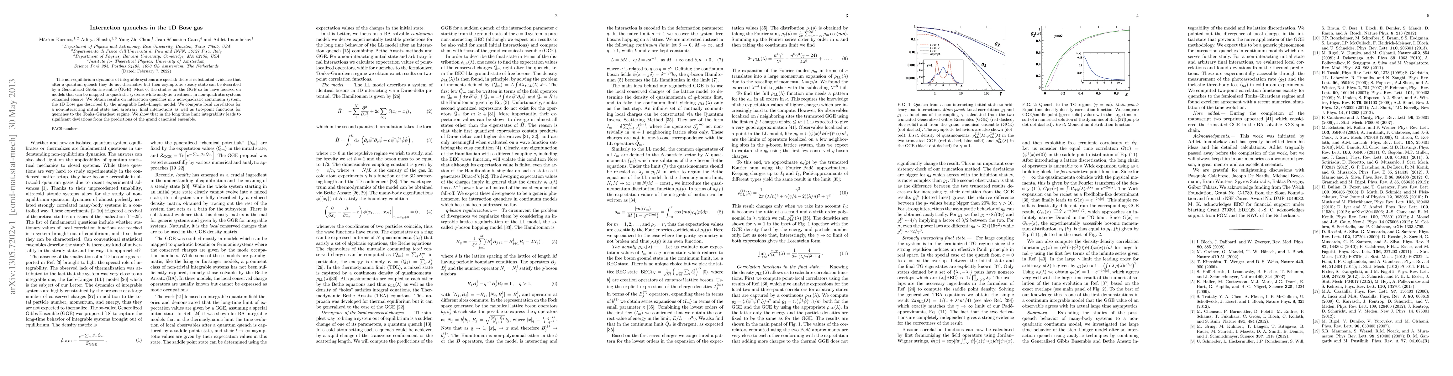 The non-equilibrium dynamics of integrable systems are special: there is substantial evidence that after a quantum quench they do not thermalize but their asymptotic steady state can be described by a Generalized Gibbs Ensemble (GGE). Most of the studies on the GGE so far have focused on models that can be mapped to quadratic systems while analytic treatment in non-quadratic systems remained elusive. We obtain results on interaction quenches in a non-quadratic continuum system, the 1D Bose gas described by the integrable Lieb-Liniger model. We compute local correlators for a non-interacting initial state and arbitrary final interactions as well as two-point functions for quenches to the Tonks-Girardeau regime. We show that in the long time limit integrability leads to significant deviations from the predictions of the grand canonical ensemble.