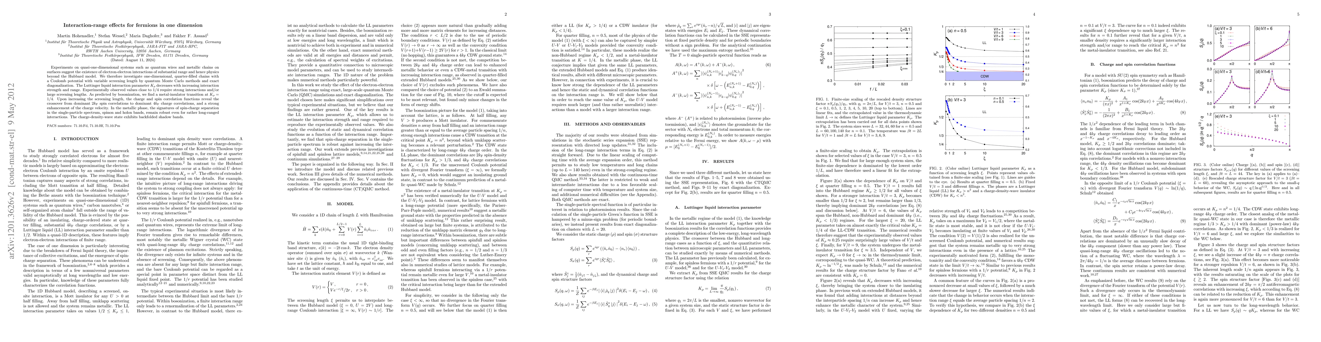 Experiments on quasi-one-dimensional systems such as quantum wires and metallic chains on surfaces suggest the existence of electron-electron interactions of substantial range and hence physics beyond the Hubbard model. We therefore investigate one-dimensional, quarter-filled chains with a Coulomb potential with variable screening length by quantum Monte Carlo methods and exact diagonalization. The Luttinger liquid interaction parameter K_rho decreases with increasing interaction strength and range. Experimentally observed values close to 1/4 require strong interactions and/or large screening lengths. As predicted by bosonization, we find a metal-insulator transition at K_rho=1/4. Upon increasing the screening length, the charge and spin correlation functions reveal the crossover from dominant 2k_F spin correlations to dominant 4k_F charge correlations, and a strong enhancement of the charge velocity. In the metallic phase, the signatures of spin-charge separation in the single-particle spectrum, spinon and holon bands, remain robust even for rather long-ranged interactions. The charge-density-wave state exhibits backfolded shadow bands.