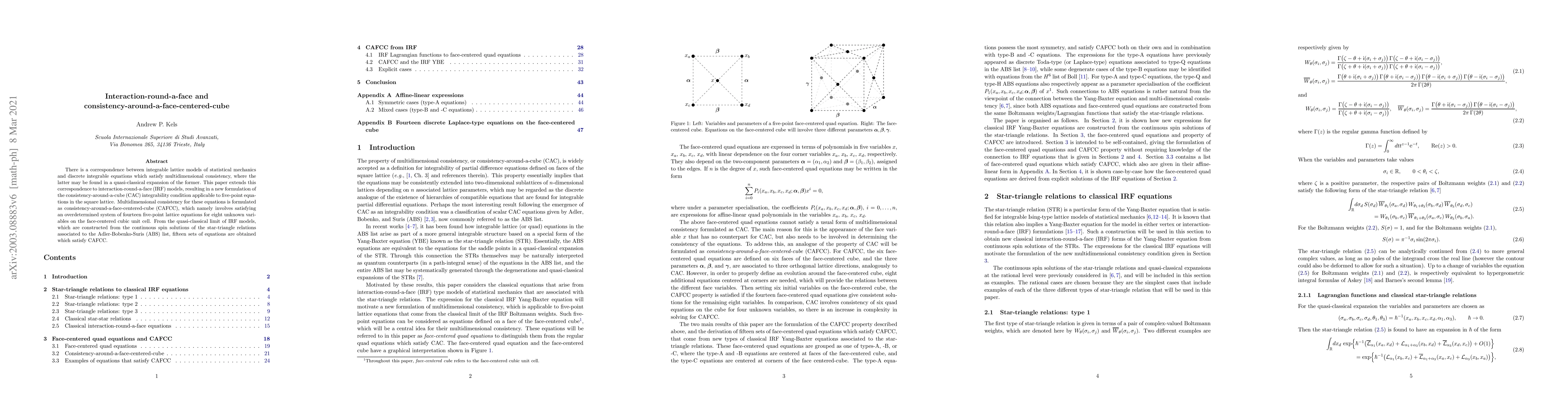 There is a correspondence between integrable lattice models of statistical mechanics and discrete integrable equations which satisfy multidimensional consistency, where the latter may be found in a quasi-classical expansion of the former. This paper extends this correspondence to interaction-round-a-face (IRF) models, resulting in a new formulation of the consistency-around-a-cube (CAC) integrability condition applicable to five-point equations in the square lattice. Multidimensional consistency for these equations is formulated as consistency-around-a-face-centered-cube (CAFCC), which namely involves satisfying an overdetermined system of fourteen five-point lattice equations for eight unknown variables on the face-centered cubic unit cell. From the quasi-classical limit of IRF models, which are constructed from the continuous spin solutions of the star-triangle relations associated to the Adler-Bobenko-Suris (ABS) list, fifteen sets of equations are obtained which satisfy CAFCC.