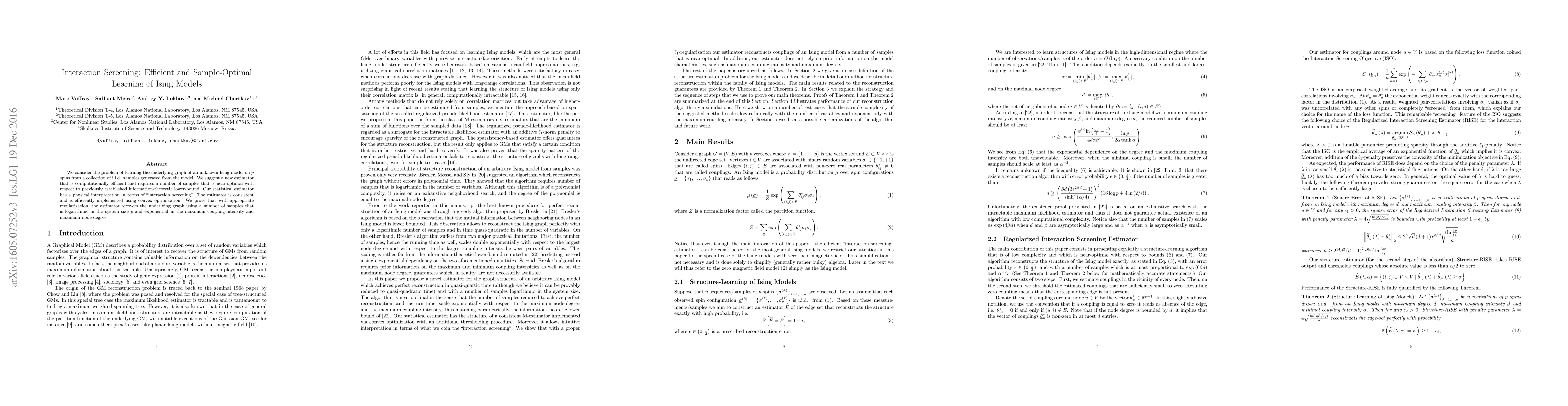 We consider the problem of learning the underlying graph of an unknown Ising model on p spins from a collection of i.i.d. samples generated from the model. We suggest a new estimator that is computationally efficient and requires a number of samples that is near-optimal with respect to previously established information-theoretic lower-bound. Our statistical estimator has a physical interpretation in terms of "interaction screening". The estimator is consistent and is efficiently implemented using convex optimization. We prove that with appropriate regularization, the estimator recovers the underlying graph using a number of samples that is logarithmic in the system size p and exponential in the maximum coupling-intensity and maximum node-degree.