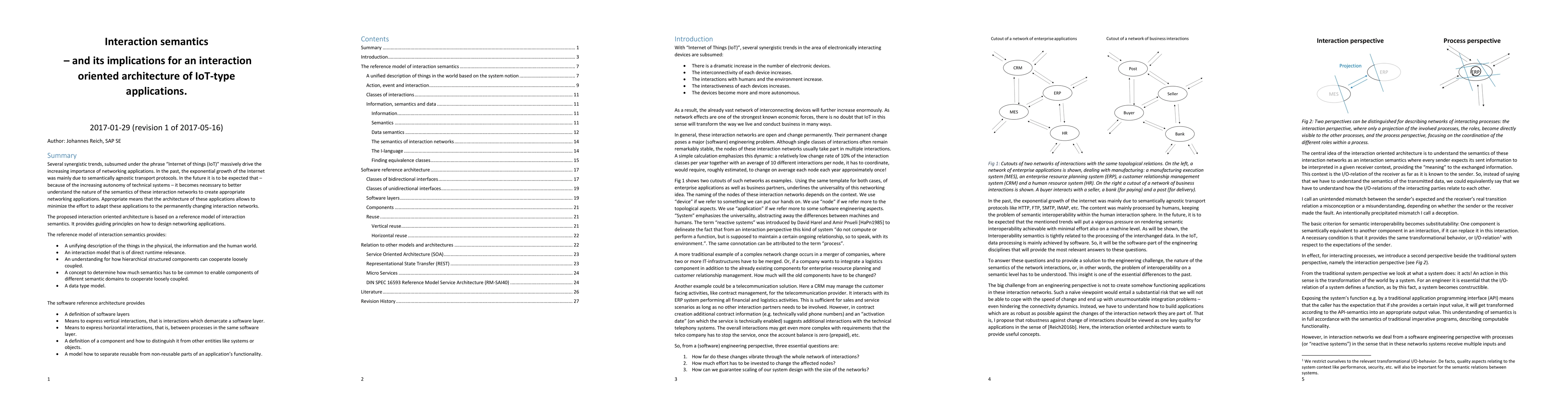 Several synergistic trends, subsumed under the phrase "Internet of things (IoT)" massively drive the increasing importance of networking applications. In the past, the exponential growth of the Internet was mainly due to semantically agnostic transport protocols. In the future it is to be expected that, because of the increasing autonomy of technical systems, it becomes necessary to better understand the nature of the semantics of these interaction networks to create appropriate networking applications. Appropriate means that the architecture of these applications allows to minimize the effort to adapt these applications to the permanently changing interaction networks. The proposed interaction oriented architecture is based on a reference model of interaction semantics. It provides guiding principles on how to design networking applications. The reference model of interaction semantics provides: a unifying description of the things in the physical, the information and the human world; an interaction model that is of direct runtime relevance; an understanding for how hierarchical structured components can cooperate loosely coupled; a concept to determine how much semantics has to be common to enable components of different semantic domains to cooperate loosely coupled; and a data type model. The software reference architecture provides: a definition of software layers; means to express vertical interactions, that is interactions which demarcate a software layer; means to express horizontal interactions, that is, between processes in the same software layer; a definition of a component and how to distinguish it from other entities like systems or objects; and a model how to separate reusable from non-reusable parts of an application's functionality.