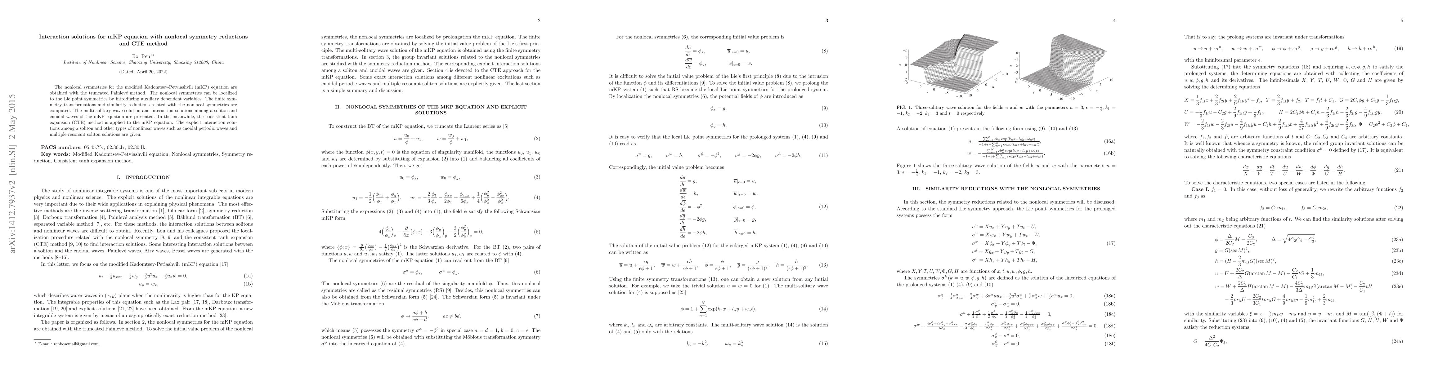 The nonlocal symmetries for the modified Kadomtsev-Petviashvili (mKP) equation are obtained with the truncated Painleve method. The nonlocal symmetries can be localized to the Lie point symmetries by introducing auxiliary dependent variables. The finite symmetry transformations and similarity reductions related with the nonlocal symmetries are computed. The multi-solitary wave solution and interaction solutions among a soliton and the cnoidal waves of the mKP equation are presented. In the meanwhile, the consistent tanh expansion (CTE) method is applied to the mKP equation. The explicit interaction solutions among a soliton and other types of nonlinear waves such as the cnoidal periodic waves and multiple resonant soliton solutions are given.