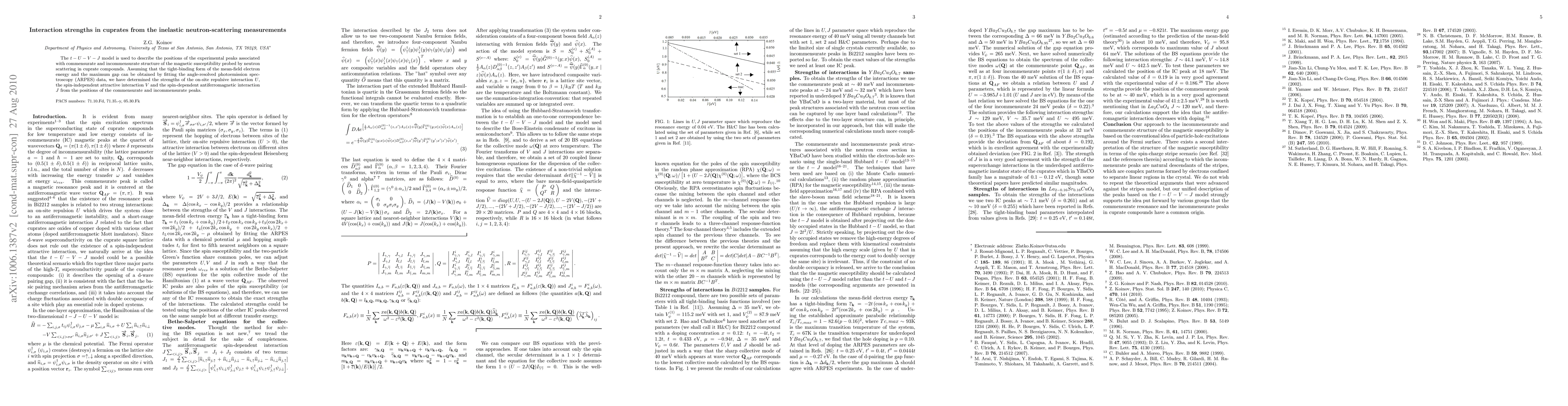 The $t-U-V-J$ model is used to describe the positions of the experimental peaks associated with commensurate and incommensurate structure of the magnetic susceptibility probed by neutron scattering in cuprate compounds. Assuming that the tight-binding form of the mean-field electron energy and the maximum gap can be obtained by fitting the angle-resolved photoemission spectroscopy (ARPES) data, we have determined the strengths of the on-site repulsive interaction $U$, the spin-independent attractive interaction $V$ and the spin-dependent antiferromagnetic interaction $J$ from the positions of the commensurate and incommensurate peaks.