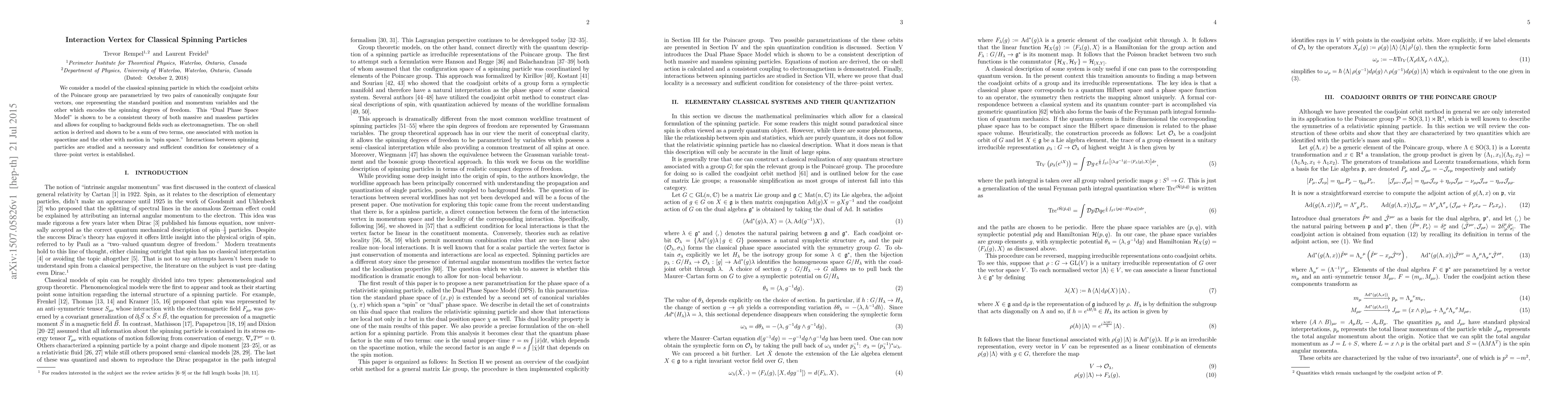 This paper explores the "Dual Phase Space Model" for classical spinning particles, demonstrating its consistency for both massive and massless particles. It derives an on-shell action comprising terms for spacetime and spin motion, and establishes a condition for the consistency of a three-point interaction vertex.