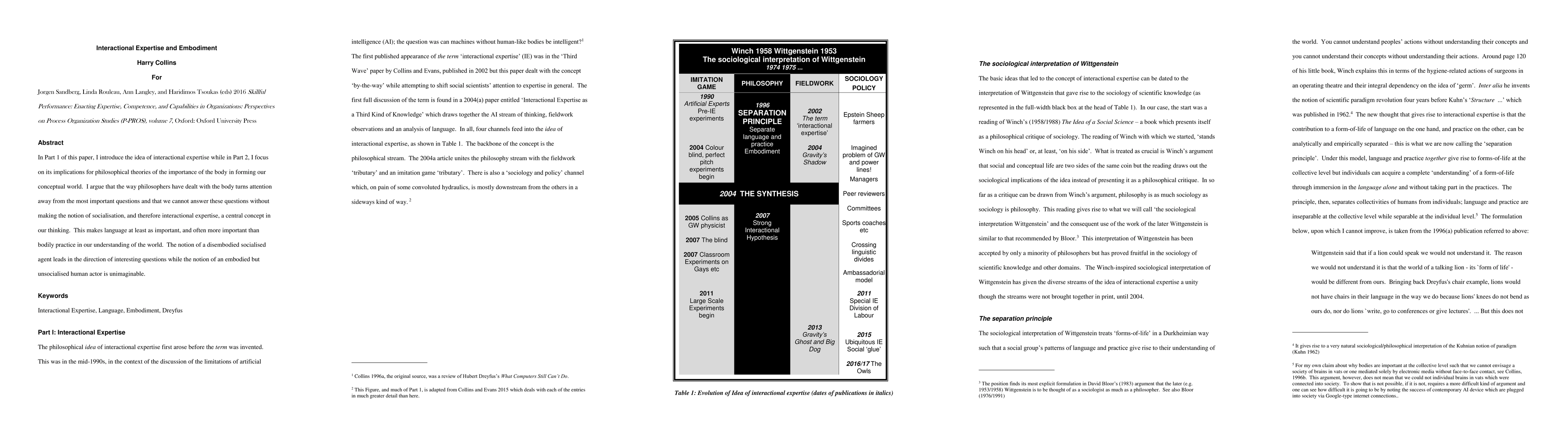 In Part 1 of this paper, I introduce the idea of interactional expertise while in Part 2, I focus on its implications for philosophical theories of the importance of the body in forming our conceptual world. I argue that the way philosophers have dealt with the body turns attention away from the most important questions and that we cannot answer these questions without making the notion of socialisation, and therefore interactional expertise, a central concept in our thinking. This makes language at least as important, and often more important than bodily practice in our understanding of the world. The notion of a disembodied socialised agent leads in the direction of interesting questions while the notion of an embodied but unsocialised human actor is unimaginable.