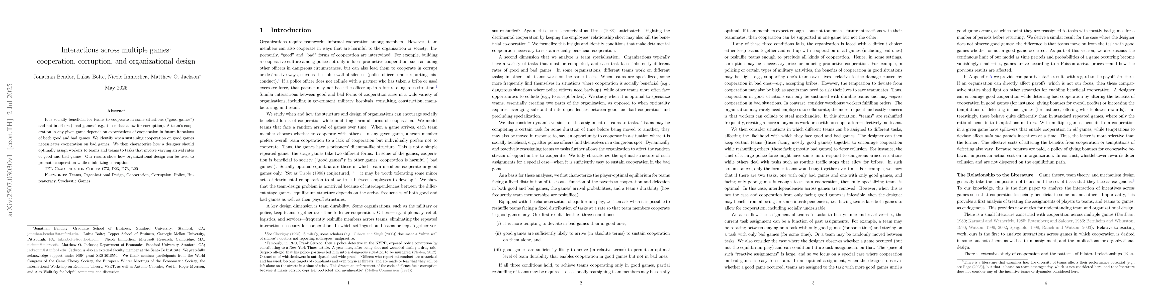 It is socially beneficial for teams to cooperate in some situations (``good games'') and not in others (``bad games;'' e.g., those that allow for corruption). A team's cooperation in any given game depends on expectations of cooperation in future iterations of both good and bad games. We identify when sustaining cooperation on good games necessitates cooperation on bad games. We then characterize how a designer should optimally assign workers to teams and teams to tasks that involve varying arrival rates of good and bad games. Our results show how organizational design can be used to promote cooperation while minimizing corruption.