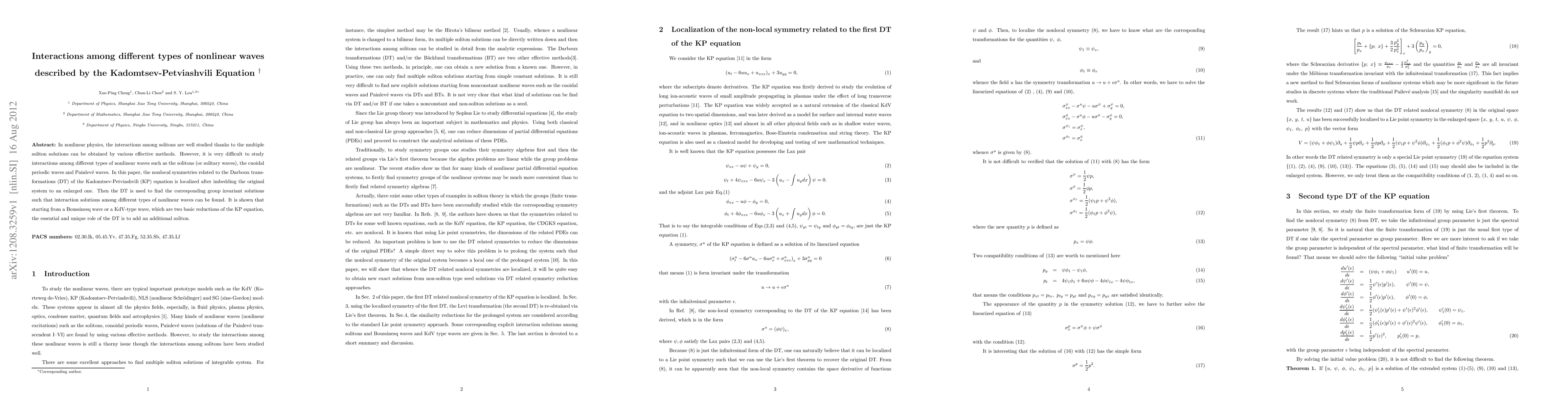 This paper explores interactions among different types of nonlinear waves, such as solitons, cnoidal waves, and Painlevé waves, using the Kadomtsev-Petviashvili (KP) equation. It employs Darboux transformations to find group invariant solutions, revealing how these transformations can generate interaction solutions by adding an additional soliton from basic reductions like Boussinesq or KdV-type waves.