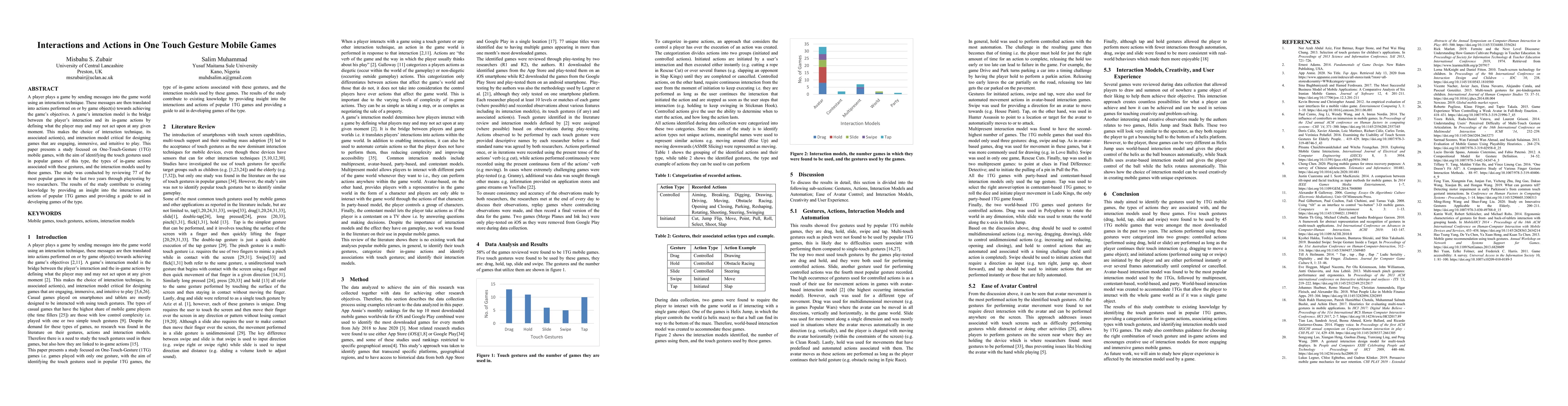 This study investigates the touch gestures, in-game actions, and interaction models in popular One Touch Gesture mobile games, revealing insights that can guide future game design. Through playtesting of 77 top games, researchers identified common gestures and their associated actions, highlighting the importance of intuitive interaction techniques.