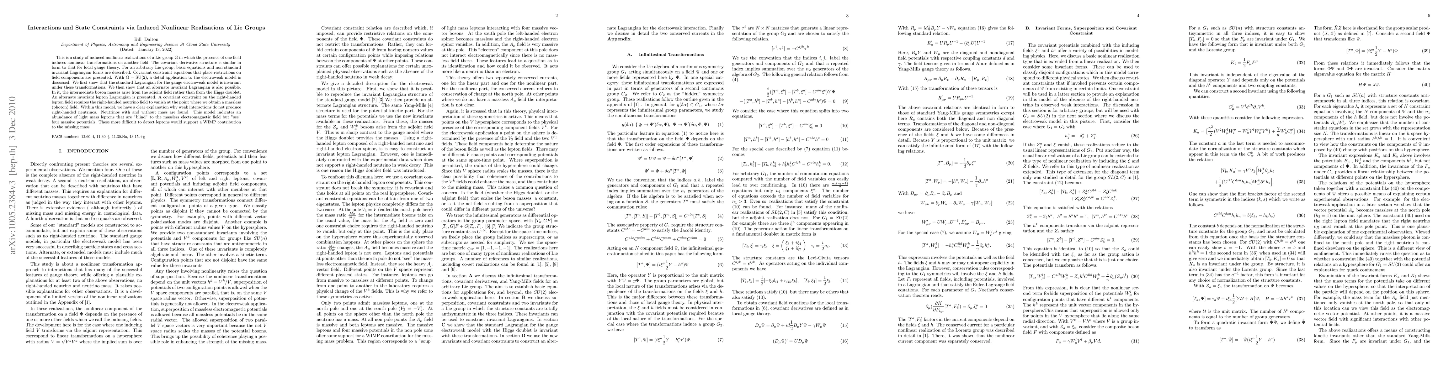 This is a study of induced nonlinear realizations of a Lie group G in which the presence of one field induces nonlinear transformations on another field. The covariant derivative structure is similar in form to that for local gauge theory. For an arbitrary Lie group, basic equations and non standard invariant Lagrangian forms are described. Covariant constraint equations that place restrictions on field components are presented. With G = SU(2), a detail application to the electroweak model is discussed. We first show that the standard Lagrangian for the gauge $SU(2) \times U(1)$ electroweak model is invariant. We then show that an alternate invariant Lagrangian is also possible. In it, the intermediate boson masses arise from the adjoint field rather than from the Higgs doublet. An alternate invariant lepton Lagrangian is presented. Covariant constraints on the right-handed lepton field lead to two right-handed neutrino fields. One vanishes at the point where we obtain a massless (photon) field and the second one has no interaction. This provides a clear explanation why weak interactions do not involve right-handed neutrinos, while permitting neutrinos with mass. This model also indicates a different region of matter involving coupled leptons that are "blind" to the massless electromagnetic field but "see" four massive potentials that are themselves blind to the electromagnetic field. We argue that these more difficult to detect "dark" fields provide a possible contribution to the missing mass.