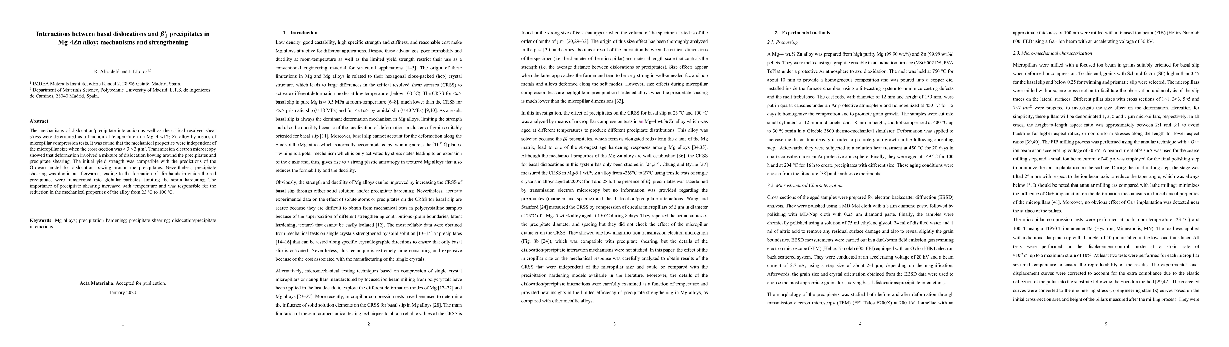 The mechanisms of dislocation/precipitate interaction as well as the critical resolved shear stress were determined as a function of temperature in a Mg-4 wt. % Zn alloy by means of micropillar compression tests. It was found that the mechanical properties were independent of the micropillar size when the cross-section was $>$ 3 x 3 $\mu$m$^2$. Transmission electron microscopy showed that deformation involved a mixture of dislocation bowing around the precipitates and precipitate shearing. The initial yield strength was compatible with the predictions of the Orowan model for dislocation bowing around the precipitates. Nevertheless, precipitate shearing was dominant afterwards, leading to the formation of slip bands in which the rod precipitates were transformed into globular particles, limiting the strain hardening. The importance of precipitate shearing increased with temperature and was responsible for the reduction in the mechanical properties of the alloy from 23C to 100C.