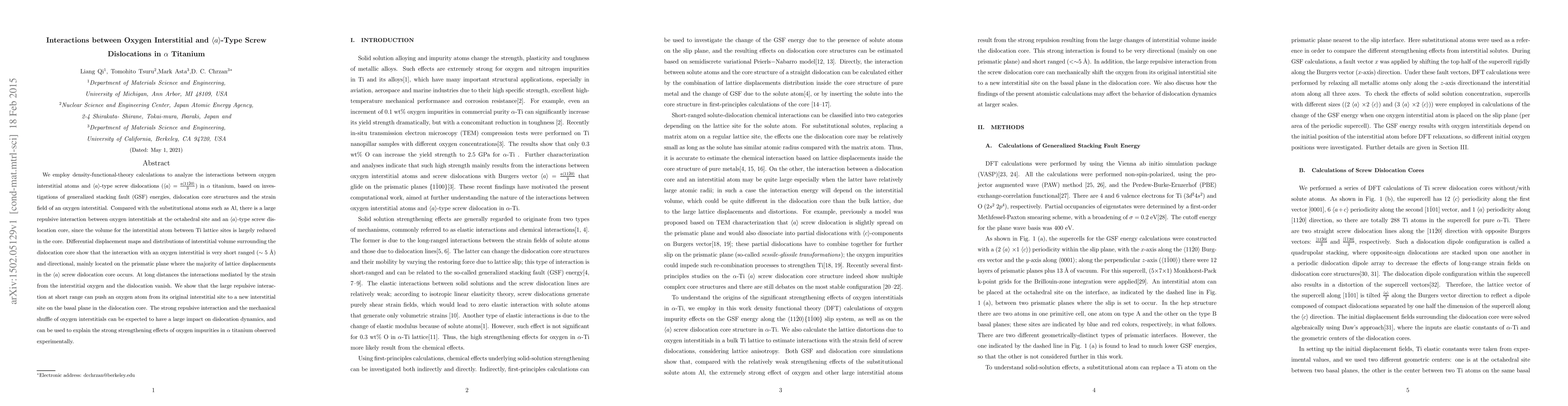This study uses density-functional-theory calculations to reveal a strong repulsive interaction between oxygen interstitials and <a>-type screw dislocations in alpha-titanium, primarily affecting the prismatic plane. The interaction is short-ranged and directional, influencing dislocation dynamics and explaining the observed strengthening effects of oxygen impurities.