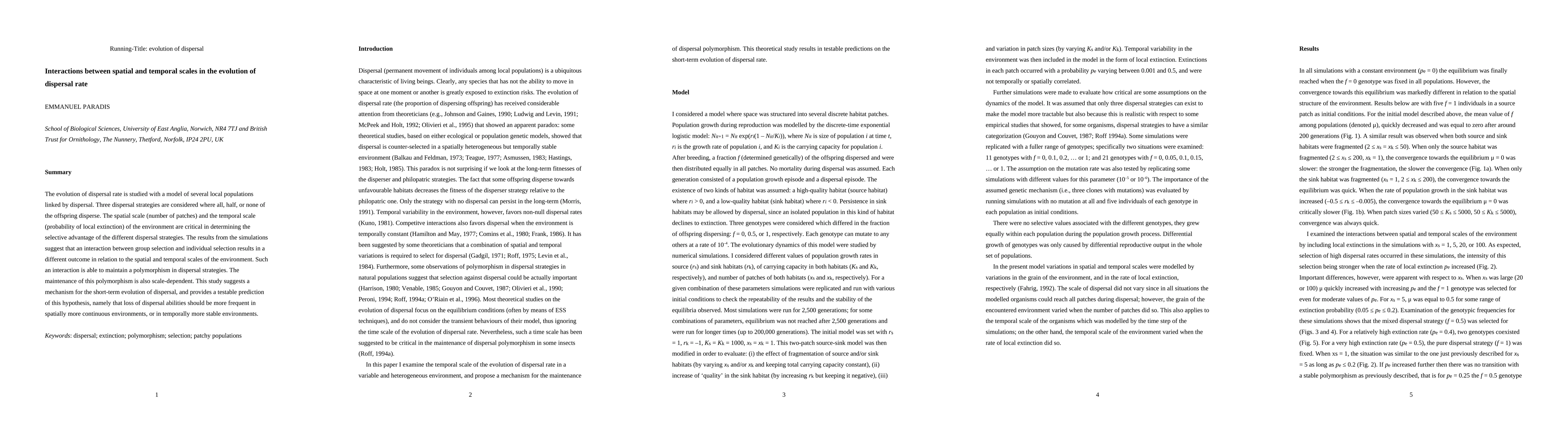 The evolution of dispersal rate is studied with a model of several local populations linked by dispersal. Three dispersal strategies are considered where all, half, or none of the offspring disperse. The spatial scale (number of patches) and the temporal scale (probability of local extinction) of the environment are critical in determining the selective advantage of the different dispersal strategies. The results from the simulations suggest that an interaction between group selection and individual selection results in a different outcome in relation to the spatial and temporal scales of the environment. Such an interaction is able to maintain a polymorphism in dispersal strategies. The maintenance of this polymorphism is also scale-dependent. This study suggests a mechanism for the short-term evolution of dispersal, and provides a testable prediction of this hypothesis, namely that loss of dispersal abilities should be more frequent in spatially more continuous environments, or in temporally more stable environments.
