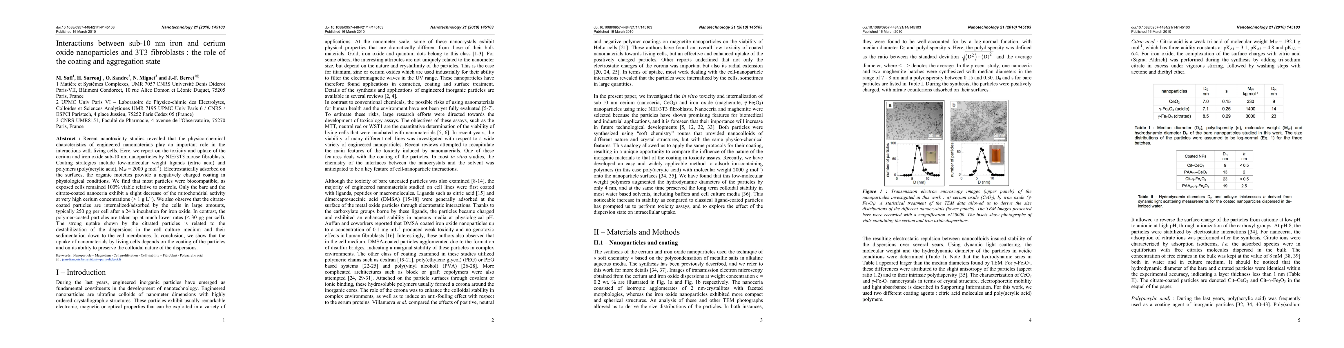 This study investigates the toxicity and cellular uptake of sub-10 nm cerium and iron oxide nanoparticles in NIH/3T3 fibroblasts, highlighting the influence of different coatings. The results show that citrate-coated particles are internalized in large amounts, while polymer-coated particles are taken up at much lower rates, indicating that the coating significantly affects nanoparticle-cell interactions.