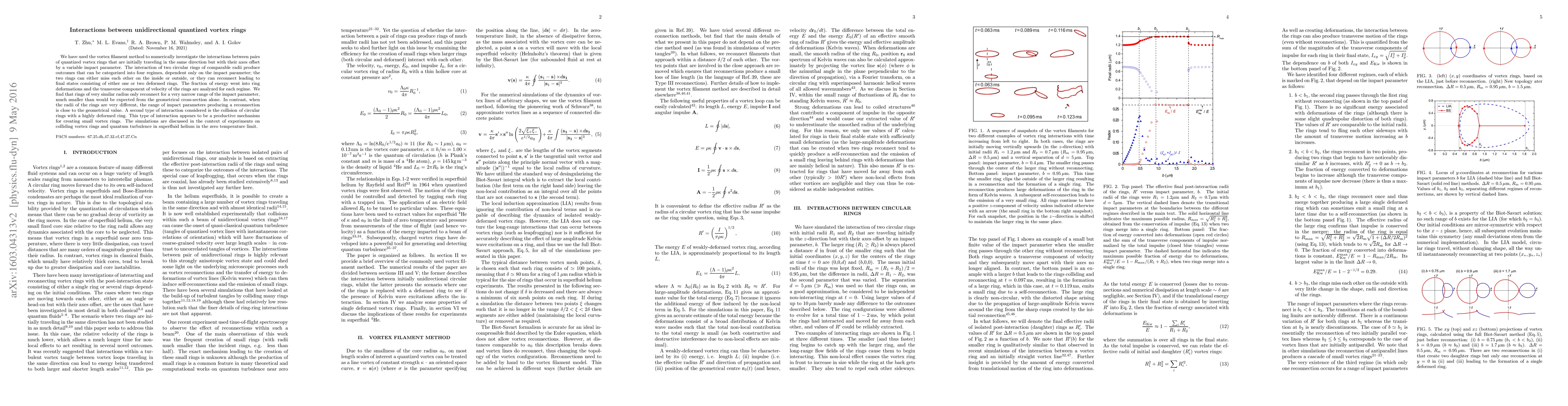 We have used the vortex filament method to numerically investigate the interactions between pairs of quantized vortex rings that are initially traveling in the same direction but with their axes offset by a variable impact parameter. The interaction of two circular rings of comparable radii produce outcomes that can be categorized into four regimes, dependent only on the impact parameter; the two rings can either miss each other on the inside or outside, or they can reconnect leading to final states consisting of either one or two deformed rings. The fraction of of energy went into ring deformations and the transverse component of velocity of the rings are analyzed for each regime. We find that rings of very similar radius only reconnect for a very narrow range of the impact parameter, much smaller than would be expected from geometrical cross-section alone. In contrast, when the radii of the rings are very different, the range of impact parameters producing a reconnection is close to the geometrical value. A second type of interaction considered is the collision of circular rings with a highly deformed ring. This type of interaction appears to be a productive mechanism for creating small vortex rings. The simulations are discussed in the context of experiments on colliding vortex rings and quantum turbulence in superfluid helium in the zero temperature limit.