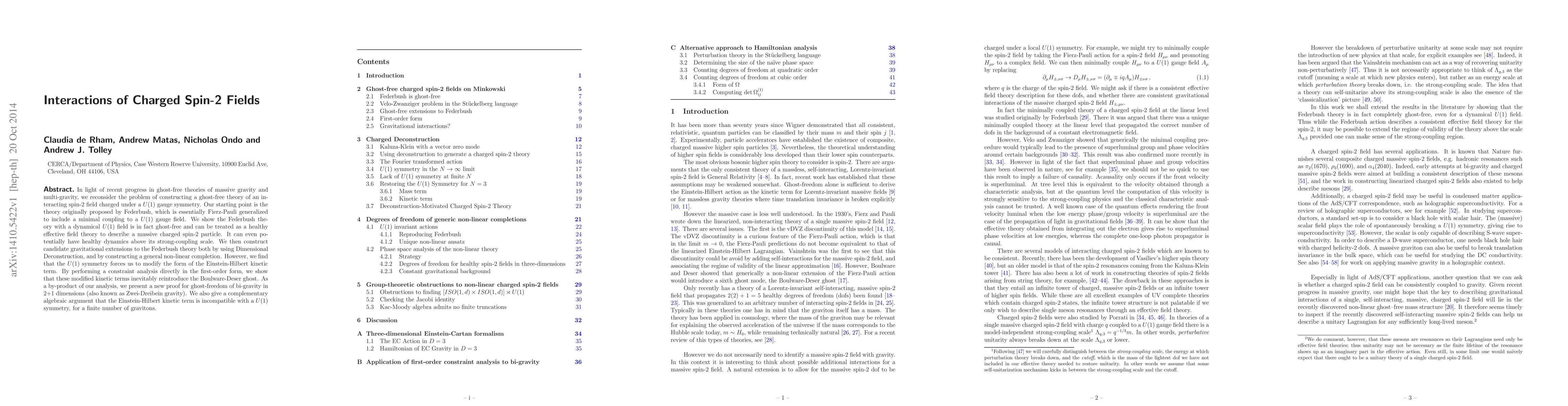 In light of recent progress in ghost-free theories of massive gravity and multi-gravity, we reconsider the problem of constructing a ghost-free theory of an interacting spin-2 field charged under a U(1) gauge symmetry. Our starting point is the theory originally proposed by Federbush, which is essentially Fierz-Pauli generalized to include a minimal coupling to a U(1) gauge field. We show the Federbush theory with a dynamical U(1) field is in fact ghost-free and can be treated as a healthy effective field theory to describe a massive charged spin-2 particle. It can even potentially have healthy dynamics above its strong-coupling scale. We then construct candidate gravitational extensions to the Federbush theory both by using Dimensional Deconstruction, and by constructing a general non-linear completion. However, we find that the U(1) symmetry forces us to modify the form of the Einstein-Hilbert kinetic term. By performing a constraint analysis directly in the first-order form, we show that these modified kinetic terms inevitably reintroduce the Boulware-Deser ghost. As a by-product of our analysis, we present a new proof for ghost-freedom of bi-gravity in 2+1 dimensions (also known as Zwei-Dreibein gravity). We also give a complementary algebraic argument that the Einstein-Hilbert kinetic term is incompatible with a U(1) symmetry, for a finite number of gravitons.