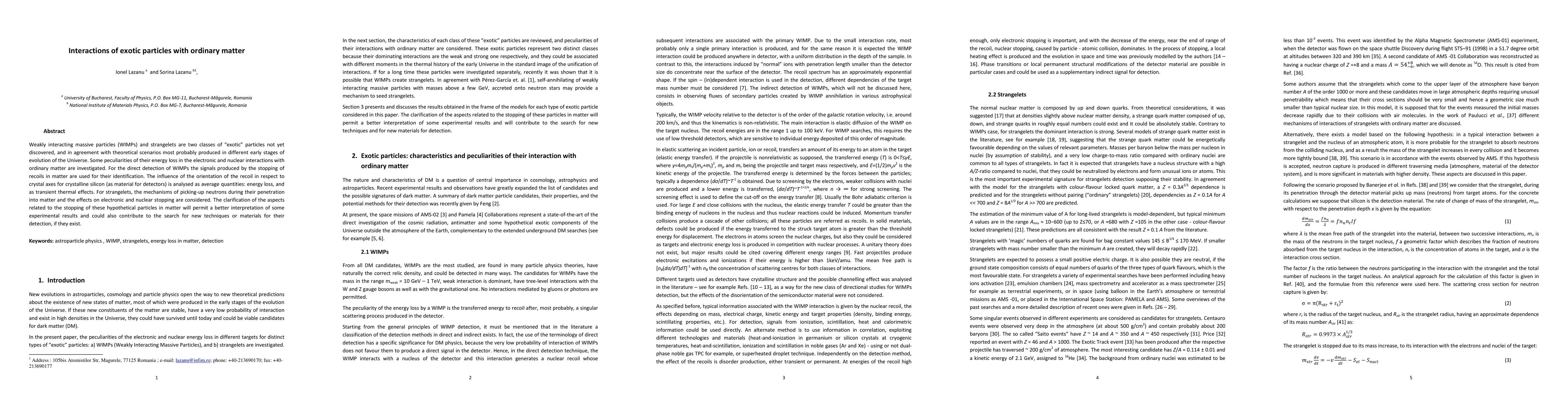 Weakly interacting massive particles (WIMPs) and strangelets are two classes of "exotic" particles not yet discovered, and in agreement with theoretical scenarios most probably produced in different early stages of evolution of the Universe. Some peculiarities of their energy loss in the electronic and nuclear interactions with ordinary matter are investigated. For the direct detection of WIMPs the signals produced by the stopping of recoils in matter are used for their identification. The influence of the orientation of the recoil in respect to crystal axes for crystalline silicon (as material for detectors) is analysed as average quantities: energy loss, and as transient thermal effects. For strangelets, the mechanisms of picking-up neutrons during their penetration into matter and the effects on electronic and nuclear stopping are considered. The clarification of the aspects related to the stopping of these hypothetical particles in matter will permit a better interpretation of some experimental results and could also contribute to the search for new techniques or materials for their detection, if they exist.