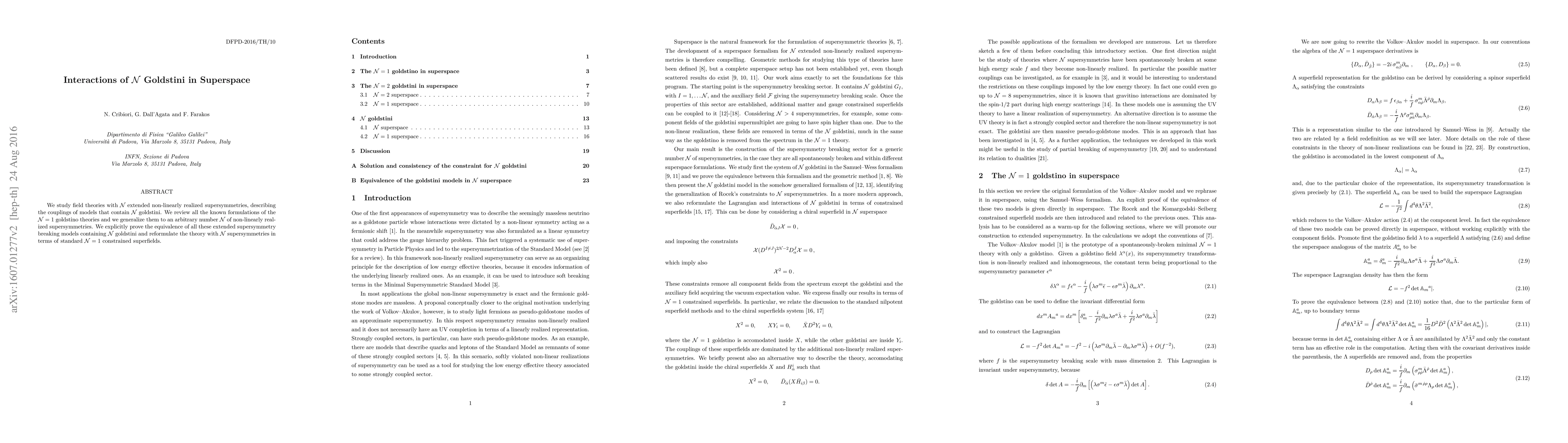 This paper explores the field theories of N extended non-linearly realized supersymmetries, focusing on the interactions and formulations of models containing N goldstini. It generalizes known N=1 goldstino theories to any N and proves their equivalence, reformulating the theory using standard N=1 constrained superfields.