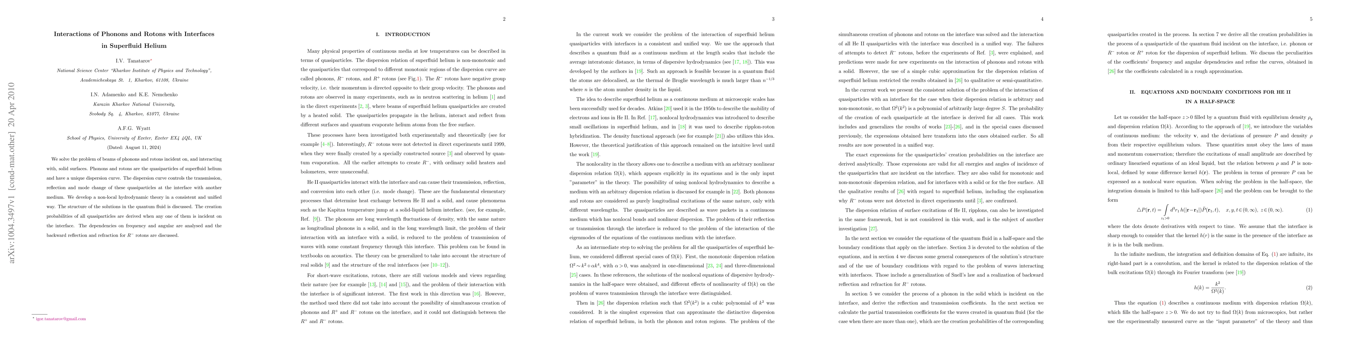 We solve the problem of beams of phonons and rotons incident on, and interacting with, solid surfaces. Phonons and rotons are the quasiparticles of superfluid helium and have a unique dispersion curve. The dispersion curve controls the transmission, reflection and mode change of these quasiparticles at the interface with another medium. We develop a non-local hydrodynamic theory in a consistent and unified way. The structure of the solutions in the quantum fluid is discussed. The creation probabilities of all quasiparticles are derived when any one of them is incident on the interface. The dependencies on frequency and angular are analysed and the backward reflection and refraction for $R^-$ rotons are discussed.