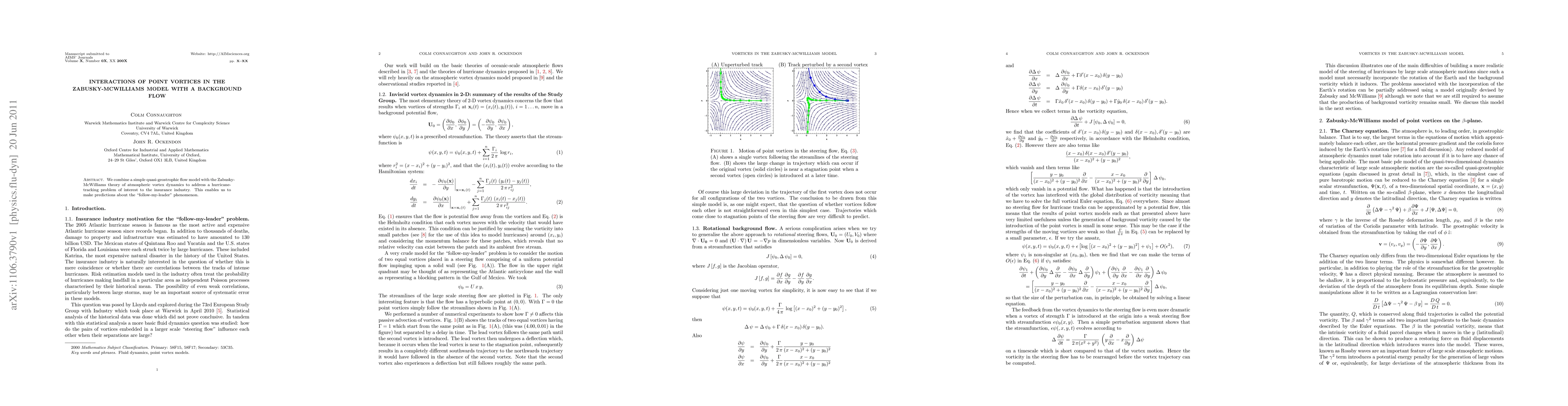 We combine a simple quasi-geostrophic flow model with the Zabusky-McWilliams theory of atmospheric vortex dynamics to address a hurricane-tracking problem of interest to the insurance industry. This enables us to make predictions about the "follow-my-leader" phenomenon.