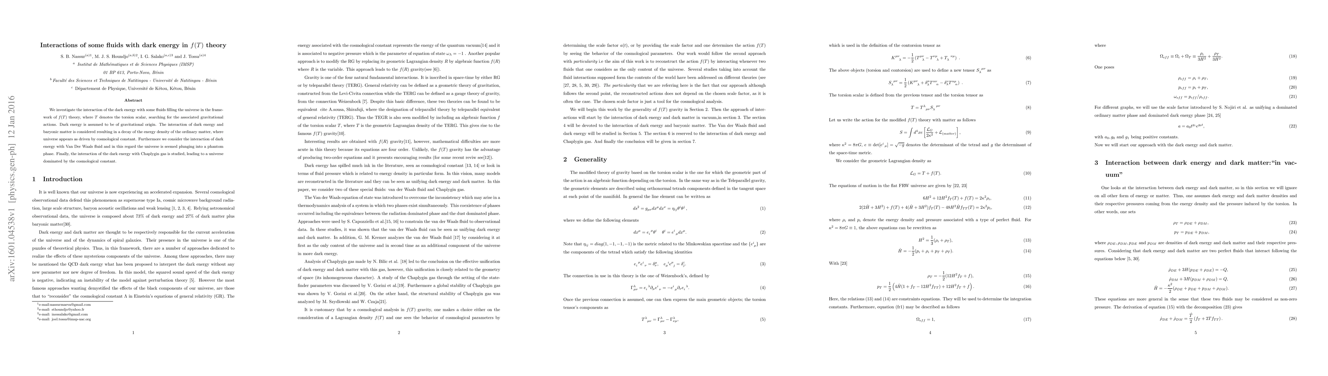 We investigate the interaction of the dark energy with some fluids filling the universe in the framework of $f(T)$ theory, where $T$ denotes the torsion scalar, searching for the associated gravitational actions. Dark energy is assumed to be of gravitational origin. The interaction of dark energy and baryonic matter is considered resulting in a decay of the energy density of the ordinary matter, where universe appears as driven by cosmological constant. Furthermore we consider the interaction of dark energy with Van Der Waals fluid and in this regard the universe is seemed plunging into a phantom phase. Finally, the interaction of the dark energy with Chaplygin gas is studied, leading to a universe dominated by the cosmological constant.
