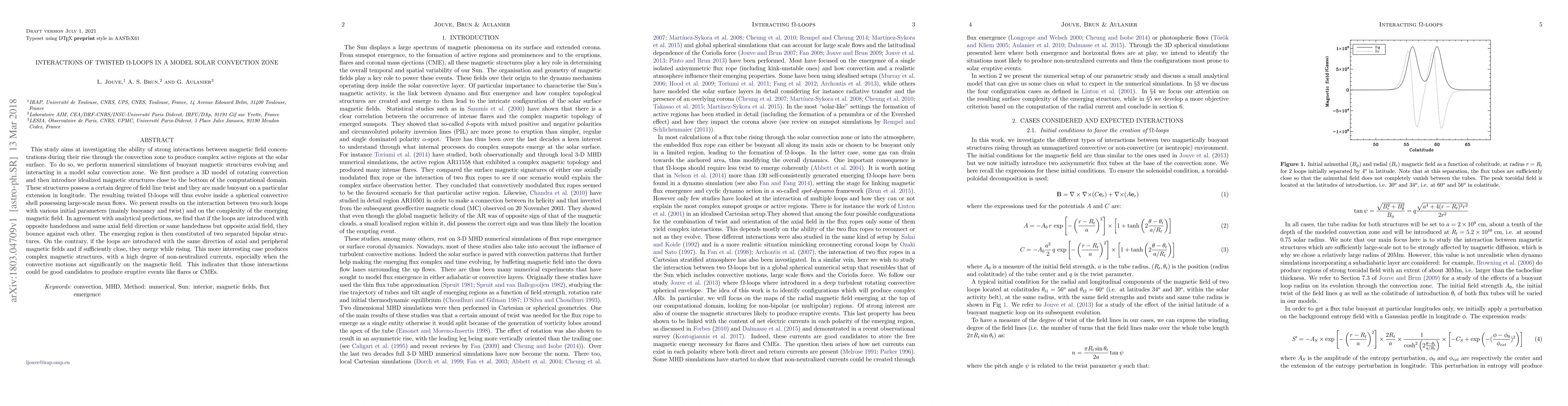 This study aims at investigating the ability of strong interactions between magnetic field concentrations during their rise through the convection zone to produce complex active regions at the solar surface. To do so, we perform numerical simulations of buoyant magnetic structures evolving and interacting in a model solar convection zone. We first produce a 3D model of rotating convection and then introduce idealized magnetic structures close to the bottom of the computational domain. These structures possess a certain degree of field line twist and they are made buoyant on a particular extension in longitude. The resulting twisted $\Omega$-loops will thus evolve inside a spherical convective shell possessing large-scale mean flows. We present results on the interaction between two such loops with various initial parameters (mainly buoyancy and twist) and on the complexity of the emerging magnetic field. In agreement with analytical predictions, we find that if the loops are introduced with opposite handedness and same axial field direction or same handedness but opposite axial field, they bounce against each other. The emerging region is then constituted of two separated bipolar structures. On the contrary, if the loops are introduced with the same direction of axial and peripheral magnetic fields and if sufficiently close, they merge while rising. This more interesting case produces complex magnetic structures, with a high degree of non-neutralized currents, especially when the convective motions act significantly on the magnetic field. This indicates that those interactions could be good candidates to produce eruptive events like flares or CMEs.
