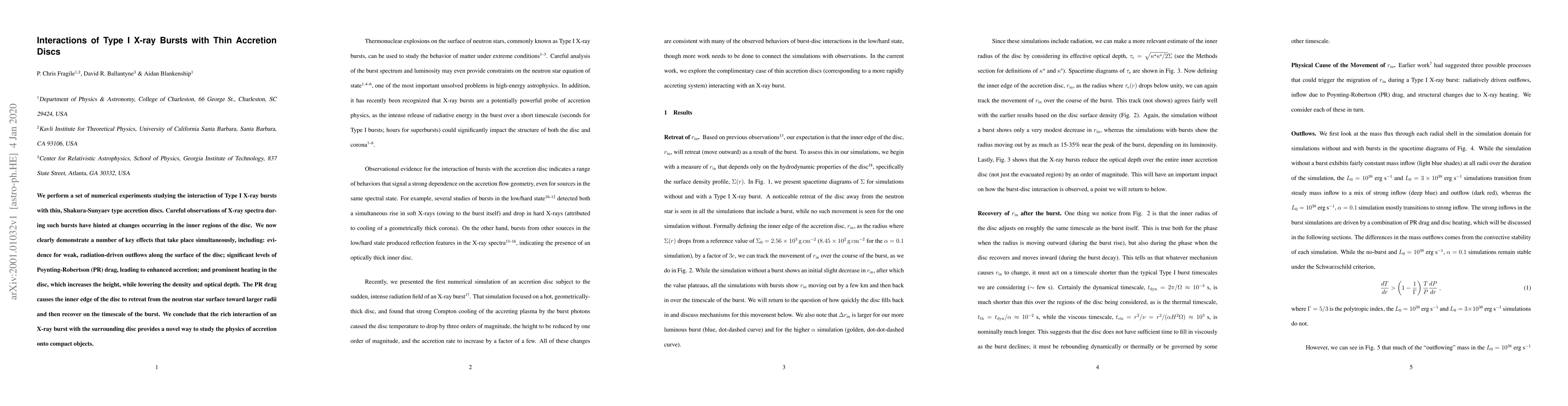 We perform a set of numerical experiments studying the interaction of Type I X-ray bursts with thin, Shakura-Sunyaev type accretion discs. Careful observations of X-ray spectra during such bursts have hinted at changes occurring in the inner regions of the disc. We now clearly demonstrate a number of key effects that take place simultaneously, including: evidence for weak, radiation-driven outflows along the surface of the disc; significant levels of Poynting-Robertson (PR) drag, leading to enhanced accretion; and prominent heating in the disc, which increases the height, while lowering the density and optical depth. The PR drag causes the inner edge of the disc to retreat from the neutron star surface toward larger radii and then recover on the timescale of the burst. We conclude that the rich interaction of an X-ray burst with the surrounding disc provides a novel way to study the physics of accretion onto compact objects.