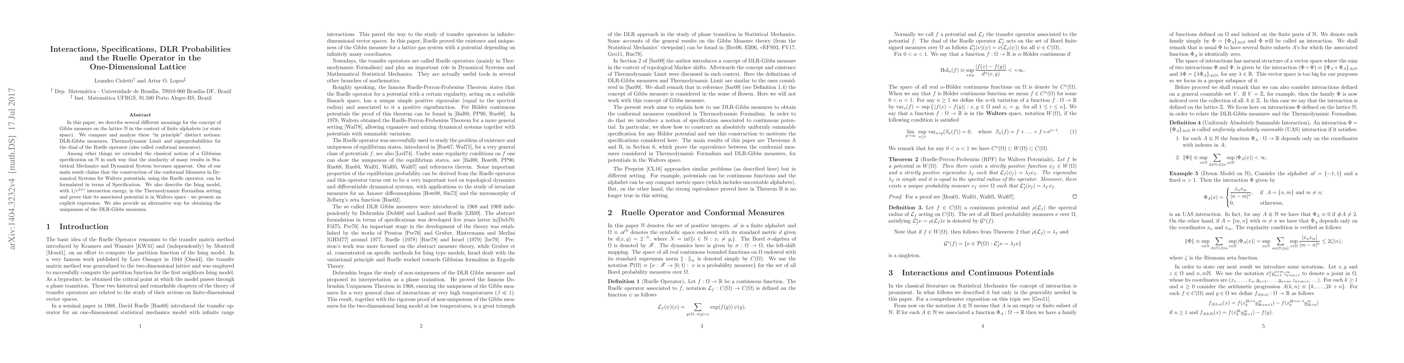 This paper explores various interpretations of Gibbs measure on the one-dimensional lattice $\mathbb{N}$, comparing DLR-Gibbs measures, Thermodynamic Limit, and eigenprobabilities for the Ruelle operator. It extends the classical Gibbsian specification to highlight connections in Statistical Mechanics and Dynamical Systems, proving the construction of conformal measures using the Ruelle operator.