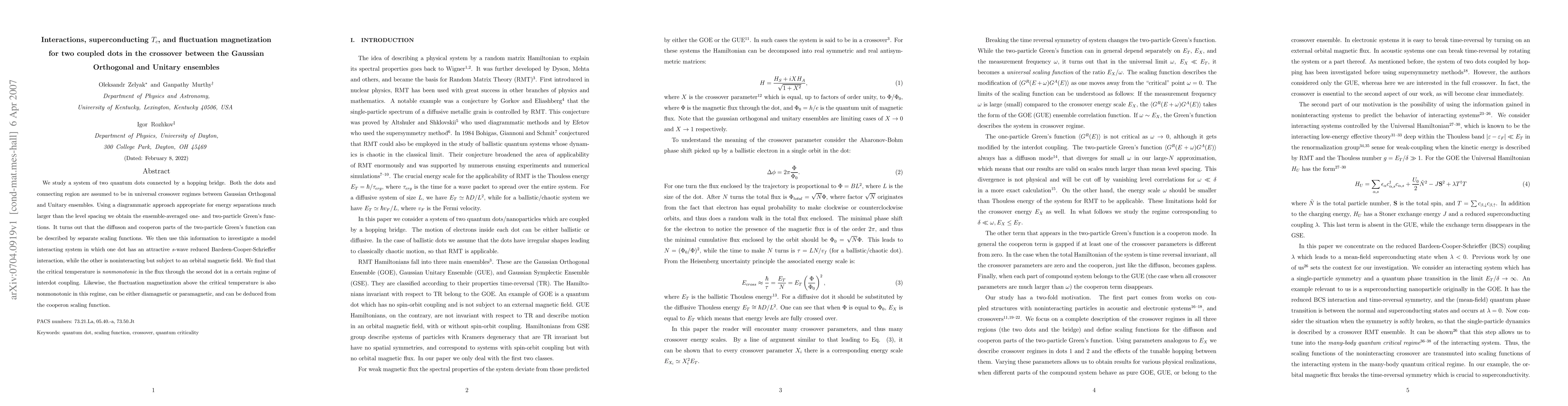 We study a system of two quantum dots connected by a hopping bridge. Both the dots and connecting region are assumed to be in universal crossover regimes between Gaussian Orthogonal and Unitary ensembles. Using a diagrammatic approach appropriate for energy separations much larger than the level spacing we obtain the ensemble-averaged one- and two-particle Green's functions. It turns out that the diffuson and cooperon parts of the two-particle Green's function can be described by separate scaling functions. We then use this information to investigate a model interacting system in which one dot has an attractive s-wave reduced Bardeen-Cooper-Schrieffer interaction, while the other is noninteracting but subject to an orbital magnetic field. We find that the critical temperature is {\it nonmonotonic} in the flux through the second dot in a certain regime of interdot coupling. Likewise, the fluctuation magnetization above the critical temperature is also nonmonotonic in this regime, can be either diamagnetic or paramagnetic, and can be deduced from the cooperon scaling function.