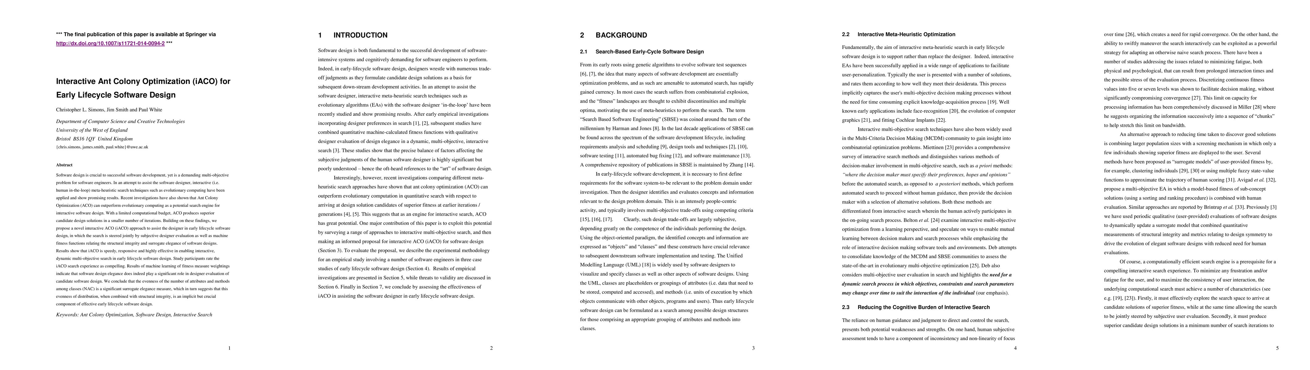 Software design is crucial to successful software development, yet is a demanding multi-objective problem for software engineers. In an attempt to assist the software designer, interactive (i.e. human in-the-loop) meta-heuristic search techniques such as evolutionary computing have been applied and show promising results. Recent investigations have also shown that Ant Colony Optimization (ACO) can outperform evolutionary computing as a potential search engine for interactive software design. With a limited computational budget, ACO produces superior candidate design solutions in a smaller number of iterations. Building on these findings, we propose a novel interactive ACO (iACO) approach to assist the designer in early lifecycle software design, in which the search is steered jointly by subjective designer evaluation as well as machine fitness functions relating the structural integrity and surrogate elegance of software designs. Results show that iACO is speedy, responsive and highly effective in enabling interactive, dynamic multi-objective search in early lifecycle software design. Study participants rate the iACO search experience as compelling. Results of machine learning of fitness measure weightings indicate that software design elegance does indeed play a significant role in designer evaluation of candidate software design. We conclude that the evenness of the number of attributes and methods among classes (NAC) is a significant surrogate elegance measure, which in turn suggests that this evenness of distribution, when combined with structural integrity, is an implicit but crucial component of effective early lifecycle software design.