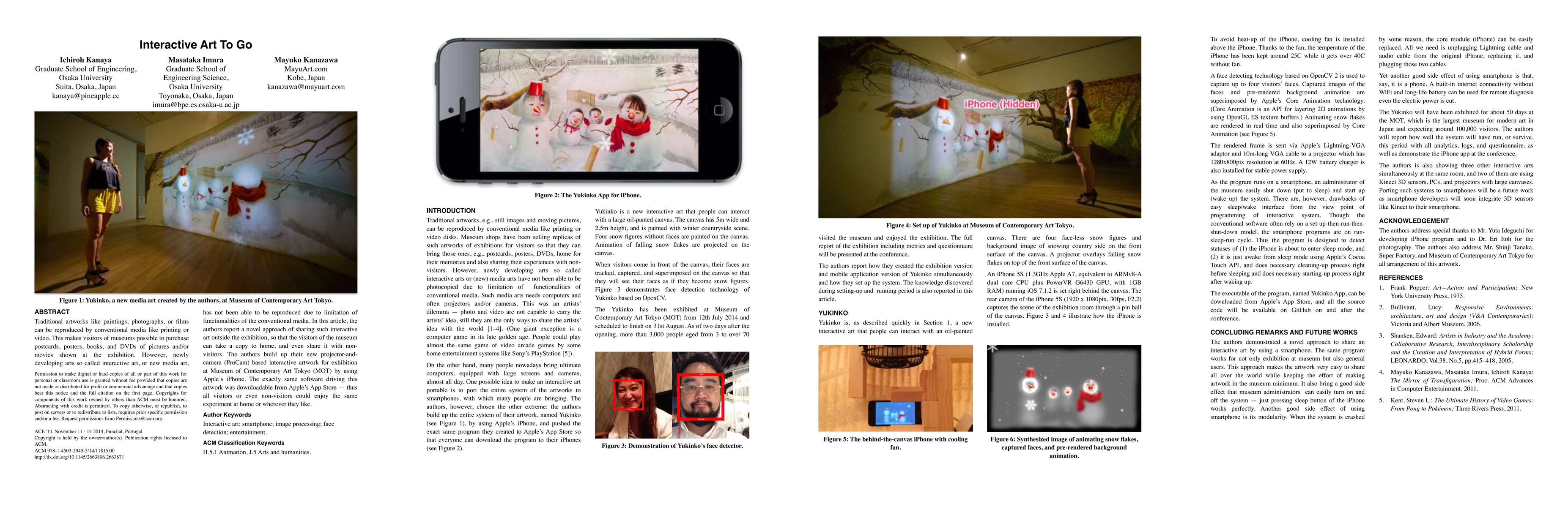 The researchers developed an interactive artwork named Yukinko using Apple's iPhone, which was exhibited at the Museum of Contemporary Art Tokyo (MOT). The same software was made available for download on Apple's App Store, allowing users to replicate the experience on their own iPhones.