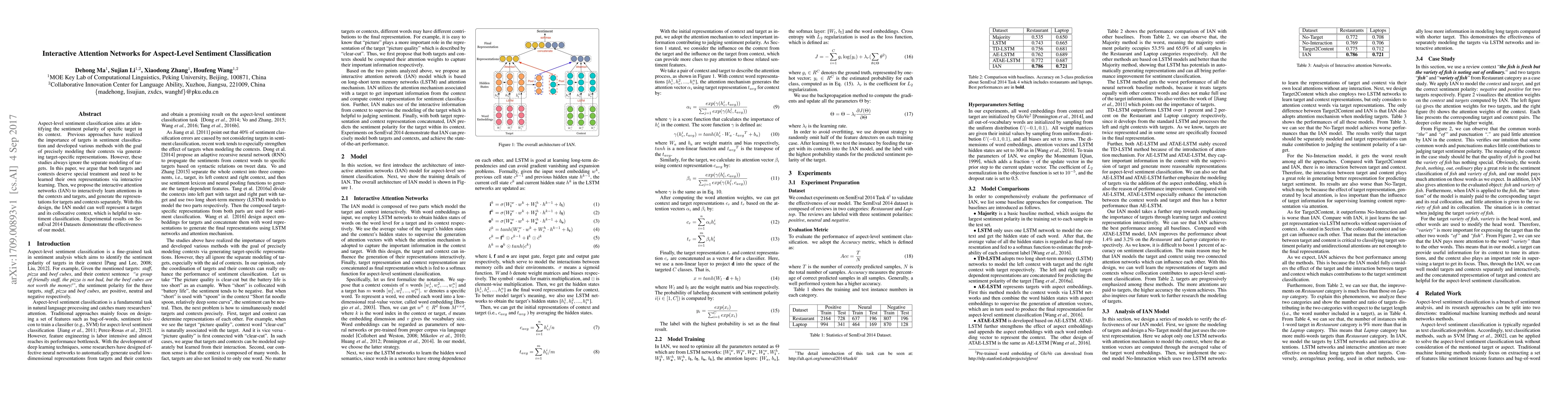 This paper introduces Interactive Attention Networks (IAN) to separately model targets and their contexts for aspect-level sentiment classification, addressing the limitation of previous methods that ignored separate modeling. The IAN framework generates distinct representations for targets and contexts through interactive learning, improving sentiment classification accuracy.