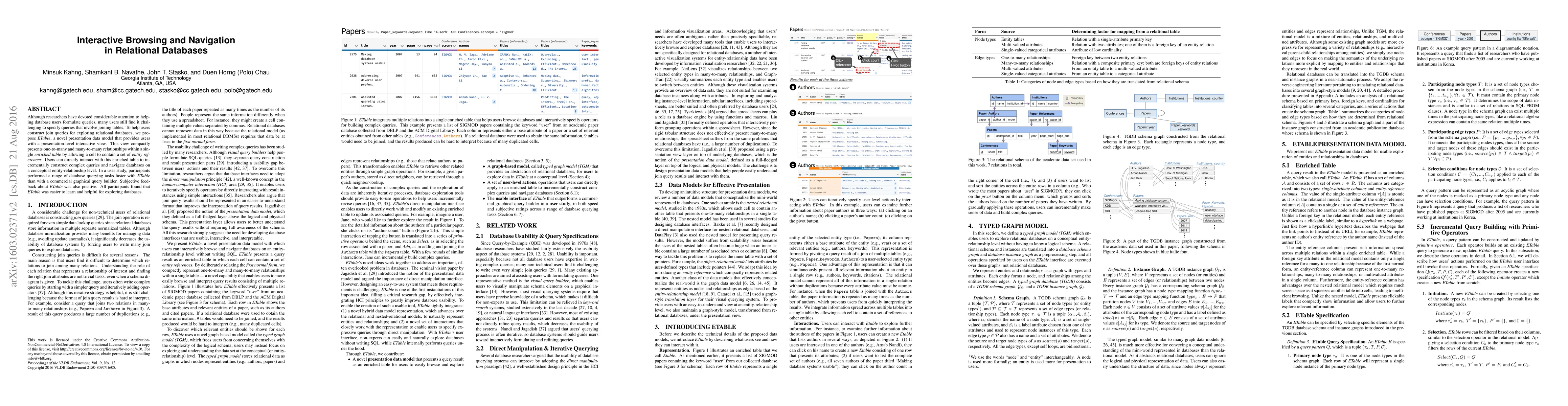 The paper proposes ETable, an interactive data model for constructing join queries in relational databases by presenting enriched tables that compactly show relationships. Users found ETable more efficient and easier to learn than a commercial graphical query builder in a user study.