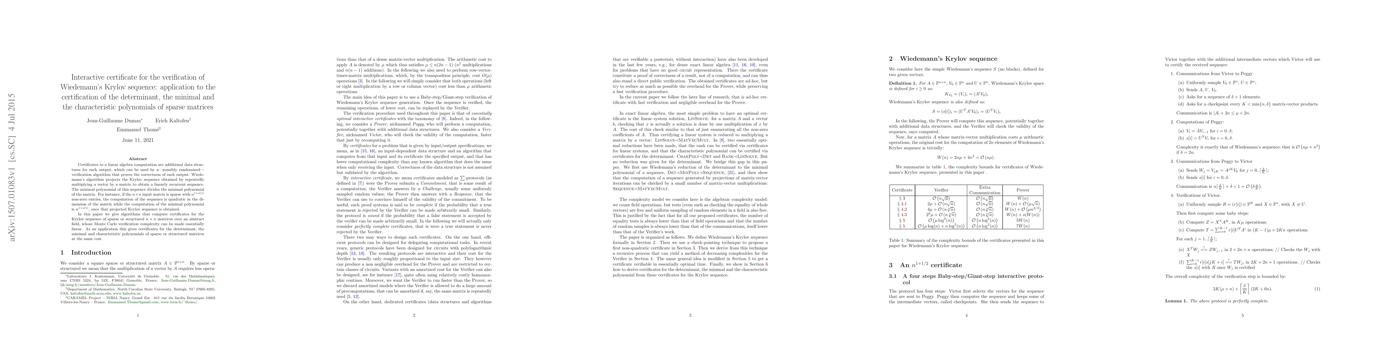 This paper presents algorithms for generating certificates for Wiedemann's Krylov sequence, which can be verified with linear complexity, and applies these to certify the determinant, minimal, and characteristic polynomials of sparse matrices efficiently.