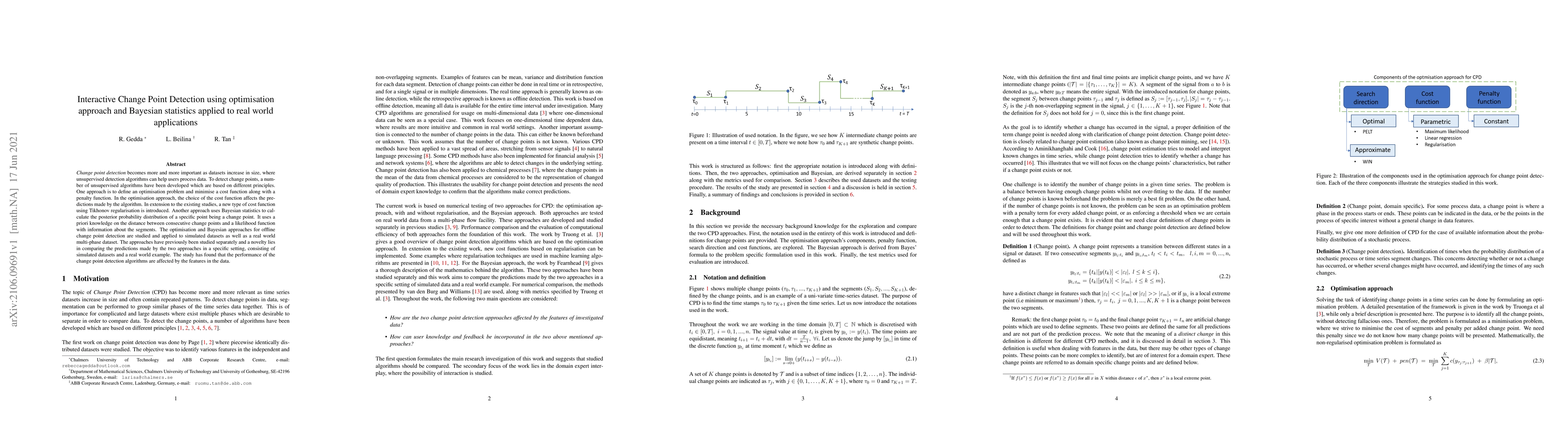 Change point detection becomes more and more important as datasets increase in size, where unsupervised detection algorithms can help users process data. To detect change points, a number of unsupervised algorithms have been developed which are based on different principles. One approach is to define an optimisation problem and minimise a cost function along with a penalty function. In the optimisation approach, the choice of the cost function affects the predictions made by the algorithm. In extension to the existing studies, a new type of cost function using Tikhonov regularisation is introduced. Another approach uses Bayesian statistics to calculate the posterior probability distribution of a specific point being a change point. It uses a priori knowledge on the distance between consecutive change points and a likelihood function with information about the segments. The optimisation and Bayesian approaches for offline change point detection are studied and applied to simulated datasets as well as a real world multi-phase dataset. The approaches have previously been studied separately and a novelty lies in comparing the predictions made by the two approaches in a specific setting, consisting of simulated datasets and a real world example. The study has found that the performance of the change point detection algorithms are affected by the features in the data.