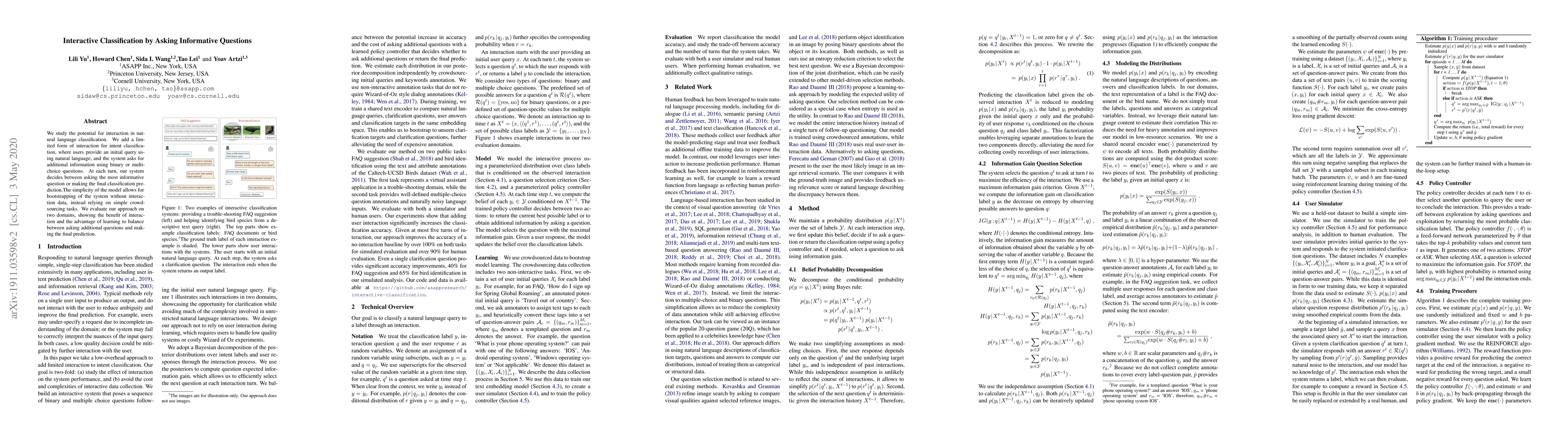 This paper explores interactive natural language classification by allowing users to provide initial queries and the system to ask follow-up questions for better intent classification. The model balances between asking informative questions and making predictions, demonstrating benefits through evaluations in two domains.