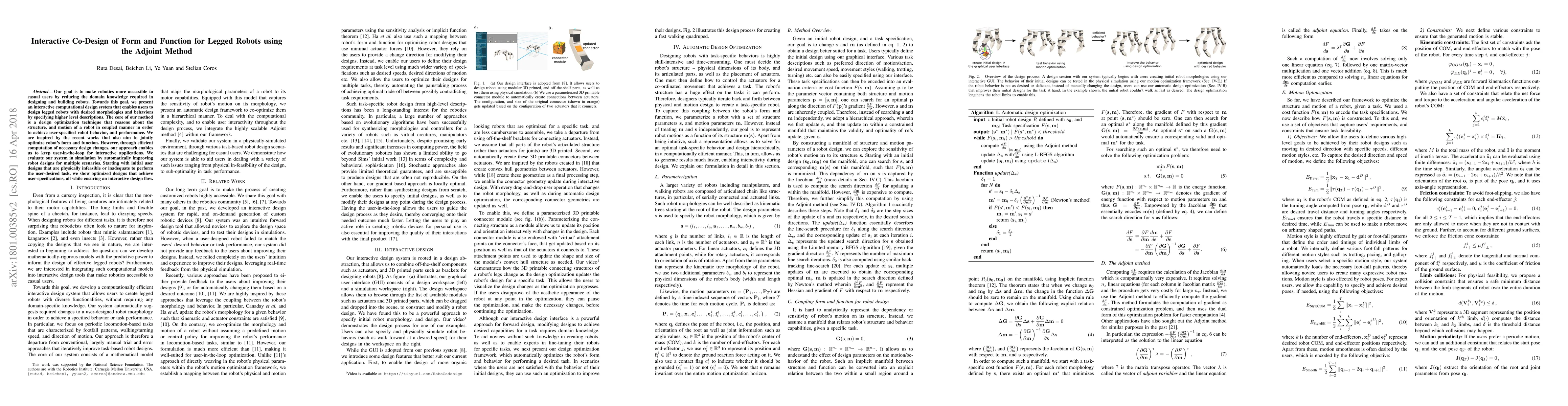 Our goal is to make robotics more accessible to casual users by reducing the domain knowledge required in designing and building robots. Towards this goal, we present an interactive computational design system that enables users to design legged robots with desired morphologies and behaviors by specifying higher level descriptions. The core of our method is a design optimization technique that reasons about the structure, and motion of a robot in coupled manner in order to achieve user-specified robot behavior, and performance. We are inspired by the recent works that also aim to jointly optimize robot's form and function. However, through efficient computation of necessary design changes, our approach enables us to keep user-in-the-loop for interactive applications. We evaluate our system in simulation by automatically improving robot designs for multiple scenarios. Starting with initial user designs that are physically infeasible or inadequate to perform the user-desired task, we show optimized designs that achieve user-specifications, all while ensuring an interactive design flow.