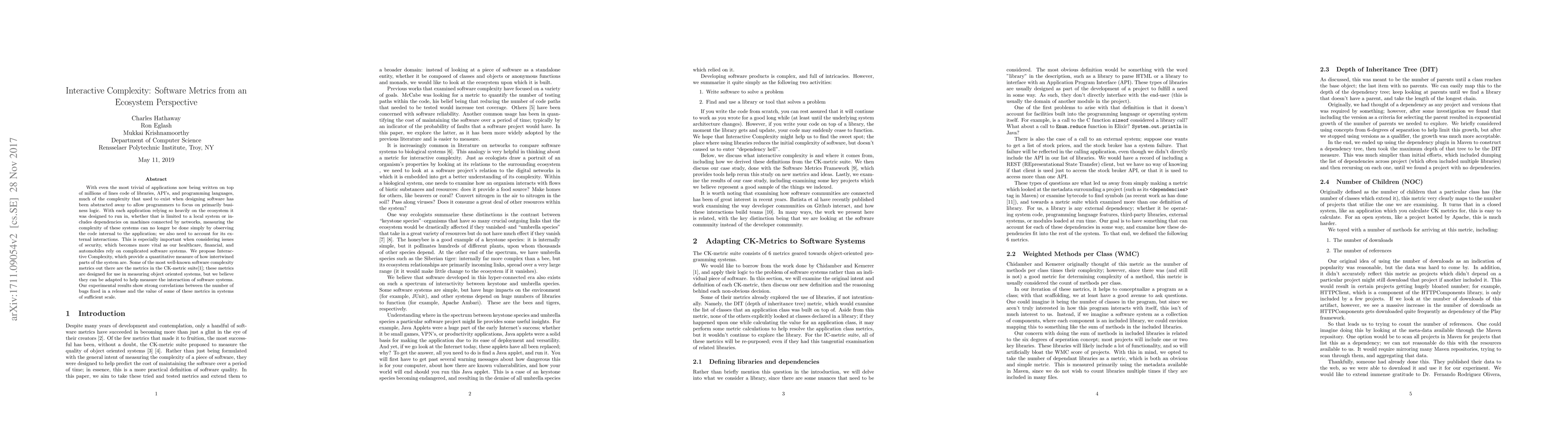 With even the most trivial of applications now being written on top of millions of lines code of libraries, API's, and programming languages, much of the complexity that used to exist when designing software has been abstracted away to allow programmers to focus on primarily business logic. With each application relying so heavily on the ecosystem it was designed to run in, whether that is limited to a local system or includes dependencies on machines connected by networks, measuring the complexity of these systems can no longer be done simply by observing the code internal to the application; we also need to account for its external interactions. This is especially important when considering issues of security, which becomes more vital as our healthcare, financial, and automobiles rely on complicated software systems. We propose Interactive Complexity, which provide a quantitative measure of how intertwined parts of the system are. Some of the most well-known software complexity metrics out there are the metrics in the CK-metric suite; these metrics are designed for use in measuring object oriented systems, but we believe they can be adapted to help measure the interaction of software systems. Our experimental results show strong correlations between the number of bugs fixed in a release and the value of some of these metrics in systems of sufficient scale.