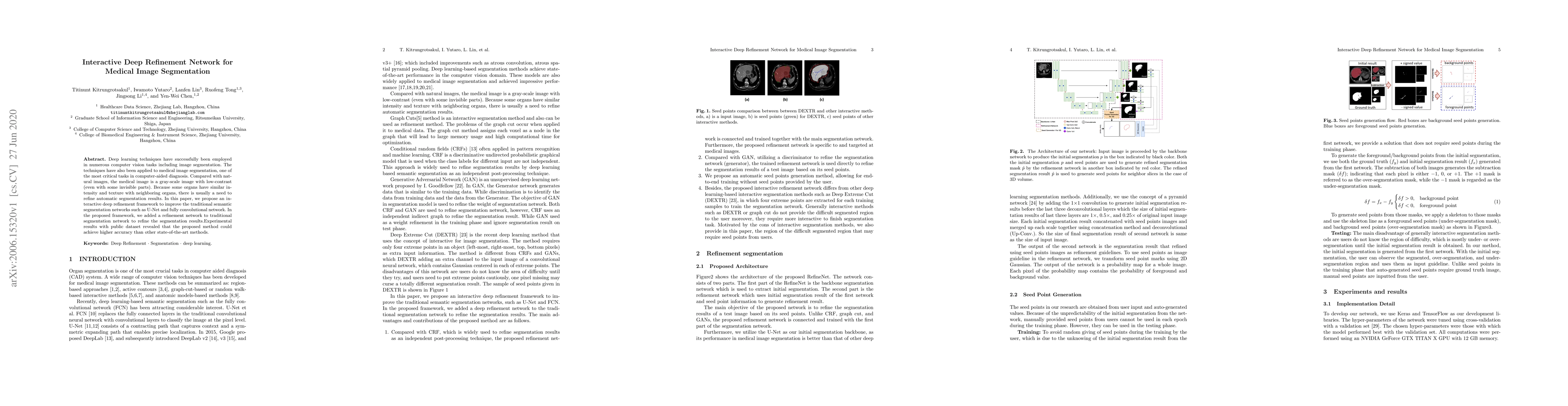 Deep learning techniques have successfully been employed in numerous computer vision tasks including image segmentation. The techniques have also been applied to medical image segmentation, one of the most critical tasks in computer-aided diagnosis. Compared with natural images, the medical image is a gray-scale image with low-contrast (even with some invisible parts). Because some organs have similar intensity and texture with neighboring organs, there is usually a need to refine automatic segmentation results. In this paper, we propose an interactive deep refinement framework to improve the traditional semantic segmentation networks such as U-Net and fully convolutional network. In the proposed framework, we added a refinement network to traditional segmentation network to refine the segmentation results.Experimental results with public dataset revealed that the proposed method could achieve higher accuracy than other state-of-the-art methods.