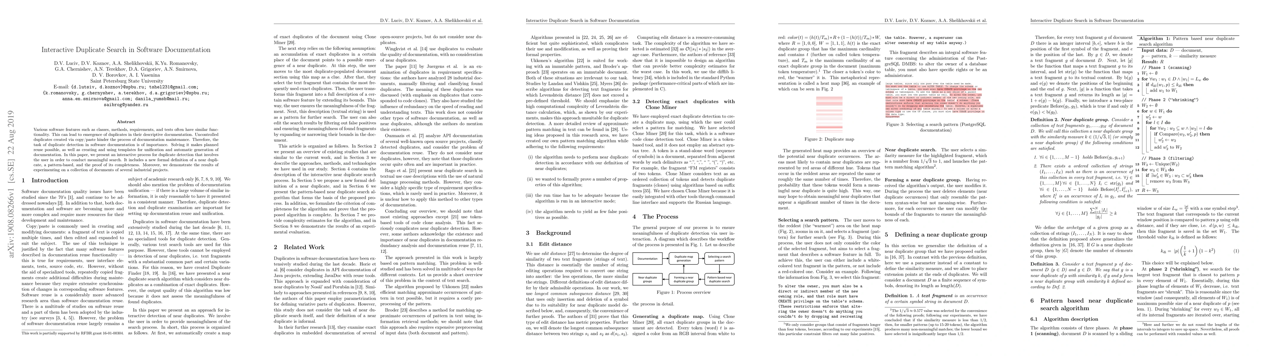 Various software features such as classes, methods, requirements, and tests often have similar functionality. This can lead to emergence of duplicates in their descriptive documentation. Uncontrolled duplicates created via copy/paste hinder the process of documentation maintenance. Therefore, the task of duplicate detection in software documentation is of importance. Solving it makes planned reuse possible, as well as creating and using templates for unification and automatic generation of documentation. In this paper, we present an interactive process for duplicate detection that involves the user in order to conduct meaningful search. It includes a new formal definition of a near duplicate, a pattern-based, and the proof of its completeness. Moreover, we demonstrate the results of experimenting on a collection of documents of several industrial projects.
