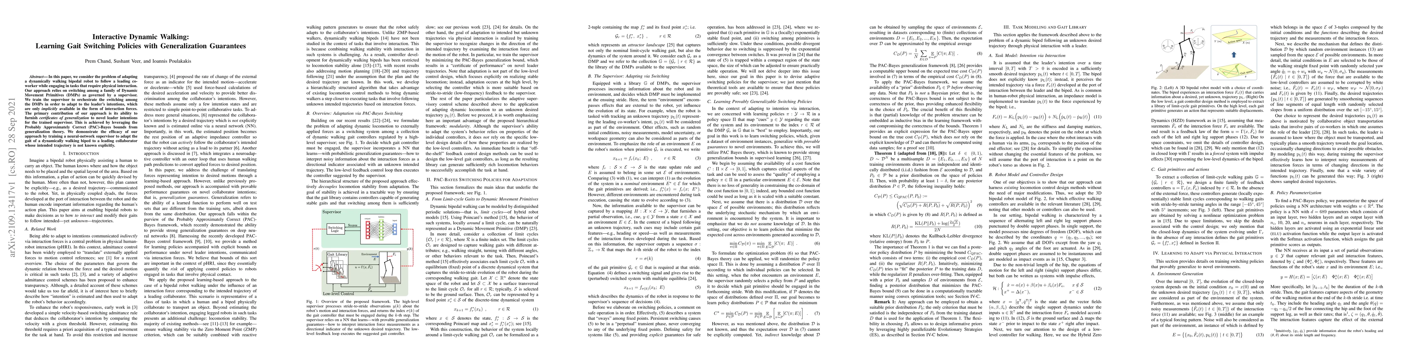 In this paper, we consider the problem of adapting a dynamically walking bipedal robot to follow a leading co-worker while engaging in tasks that require physical interaction. Our approach relies on switching among a family of Dynamic Movement Primitives (DMPs) as governed by a supervisor. We train the supervisor to orchestrate the switching among the DMPs in order to adapt to the leader's intentions, which are only implicitly available in the form of interaction forces. The primary contribution of our approach is its ability to furnish certificates of generalization to novel leader intentions for the trained supervisor. This is achieved by leveraging the Probably Approximately Correct (PAC)-Bayes bounds from generalization theory. We demonstrate the efficacy of our approach by training a neural-network supervisor to adapt the gait of a dynamically walking biped to a leading collaborator whose intended trajectory is not known explicitly.