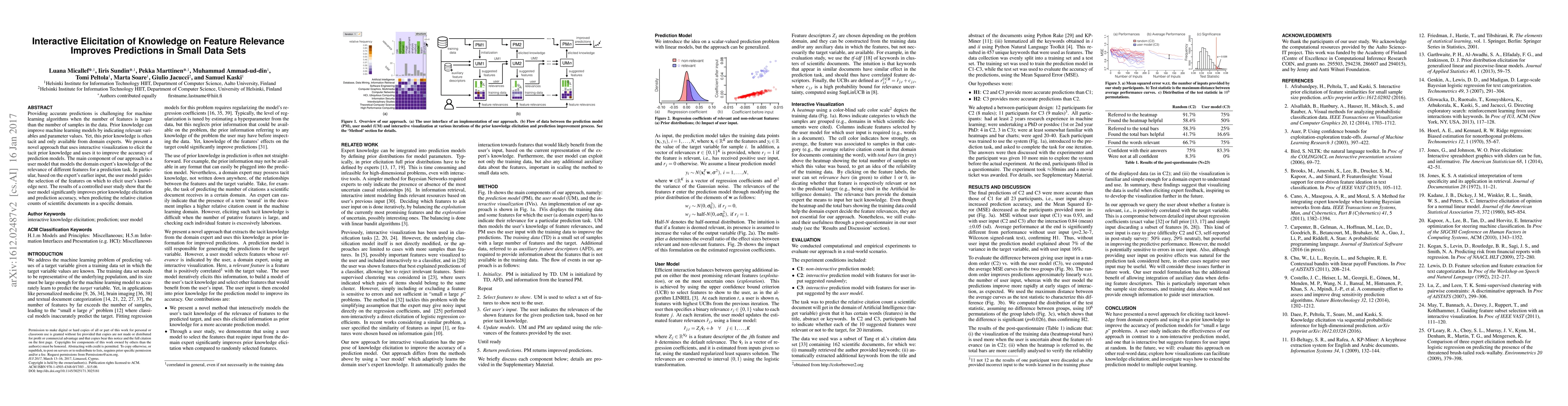 This paper proposes an interactive visualization method to elicit tacit prior knowledge from domain experts to improve prediction accuracy in small data sets. The approach uses a user model to guide feature selection based on expert input, leading to significant improvements in both knowledge elicitation and prediction accuracy, as demonstrated in a study predicting citation counts of scientific documents.