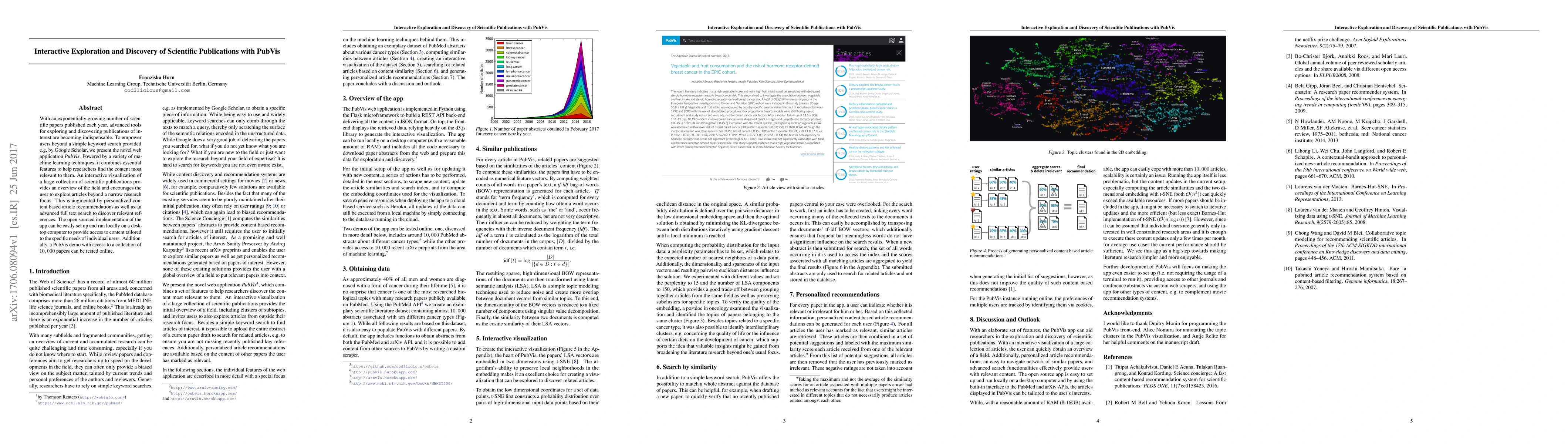 With an exponentially growing number of scientific papers published each year, advanced tools for exploring and discovering publications of interest are becoming indispensable. To empower users beyond a simple keyword search provided e.g. by Google Scholar, we present the novel web application PubVis. Powered by a variety of machine learning techniques, it combines essential features to help researchers find the content most relevant to them. An interactive visualization of a large collection of scientific publications provides an overview of the field and encourages the user to explore articles beyond a narrow research focus. This is augmented by personalized content based article recommendations as well as an advanced full text search to discover relevant references. The open sourced implementation of the app can be easily set up and run locally on a desktop computer to provide access to content tailored to the specific needs of individual users. Additionally, a PubVis demo with access to a collection of 10,000 papers can be tested online.