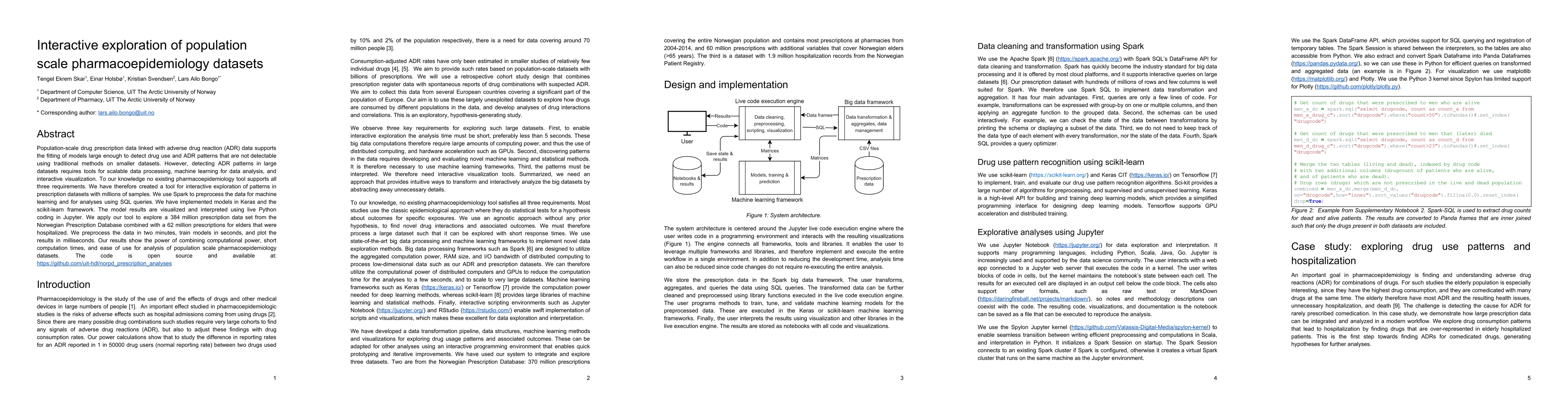This paper introduces a tool for interactive exploration of large-scale pharmacoepidemiology datasets, combining Spark for data preprocessing, Keras and scikit-learn for machine learning, and Jupyter for visualization. The tool enables rapid analysis of millions of prescription records, demonstrating its effectiveness on a dataset from Norway.