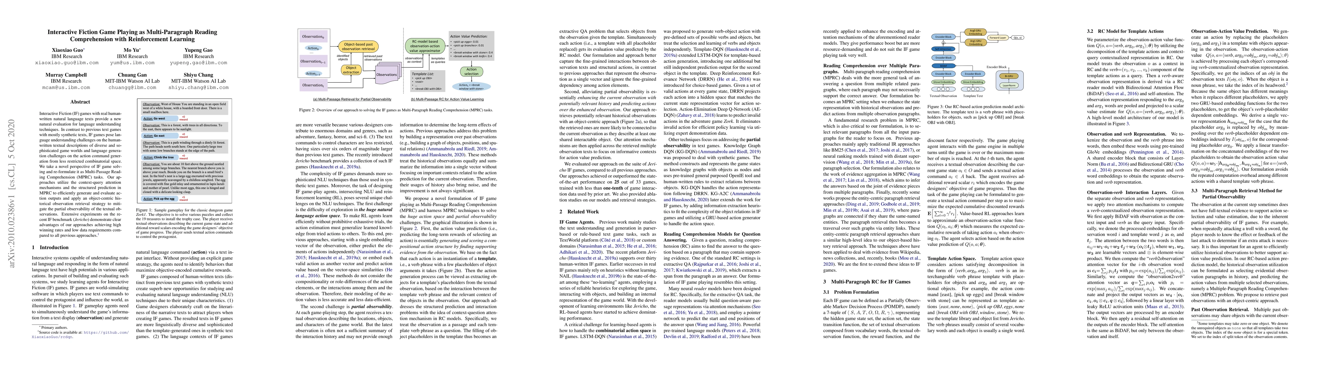 This paper proposes using Interactive Fiction games as a natural evaluation for language comprehension techniques, framing game playing as Multi-Passage Reading Comprehension. The authors employ reinforcement learning with context-query attention and structured prediction to generate and evaluate actions, achieving high winning rates and low data requirements compared to previous methods.
