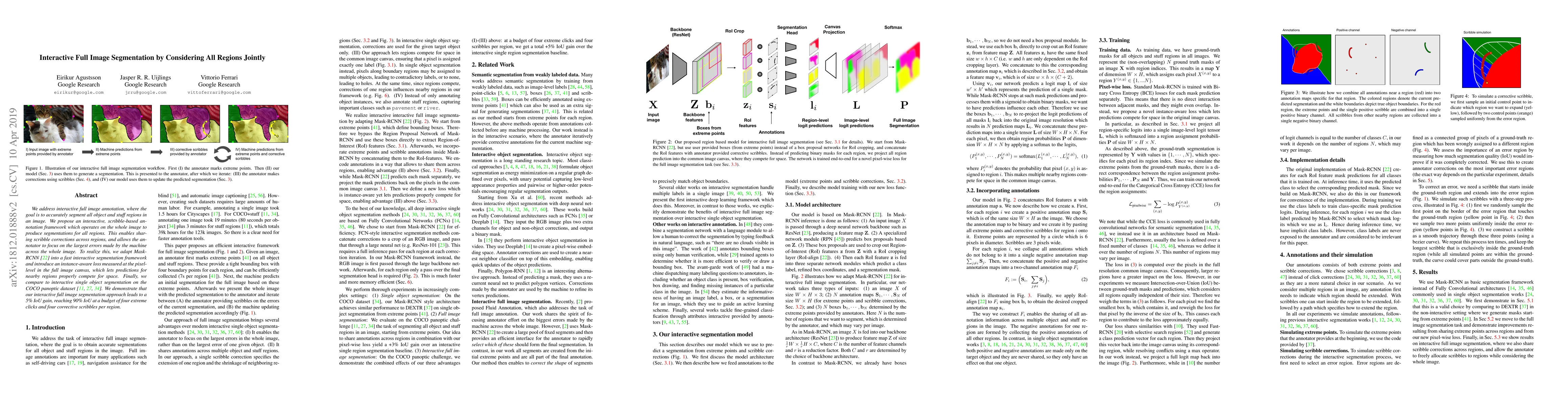 We address interactive full image annotation, where the goal is to accurately segment all object and stuff regions in an image. We propose an interactive, scribble-based annotation framework which operates on the whole image to produce segmentations for all regions. This enables sharing scribble corrections across regions, and allows the annotator to focus on the largest errors made by the machine across the whole image. To realize this, we adapt Mask-RCNN into a fast interactive segmentation framework and introduce an instance-aware loss measured at the pixel-level in the full image canvas, which lets predictions for nearby regions properly compete for space. Finally, we compare to interactive single object segmentation on the COCO panoptic dataset. We demonstrate that our interactive full image segmentation approach leads to a 5% IoU gain, reaching 90% IoU at a budget of four extreme clicks and four corrective scribbles per region.