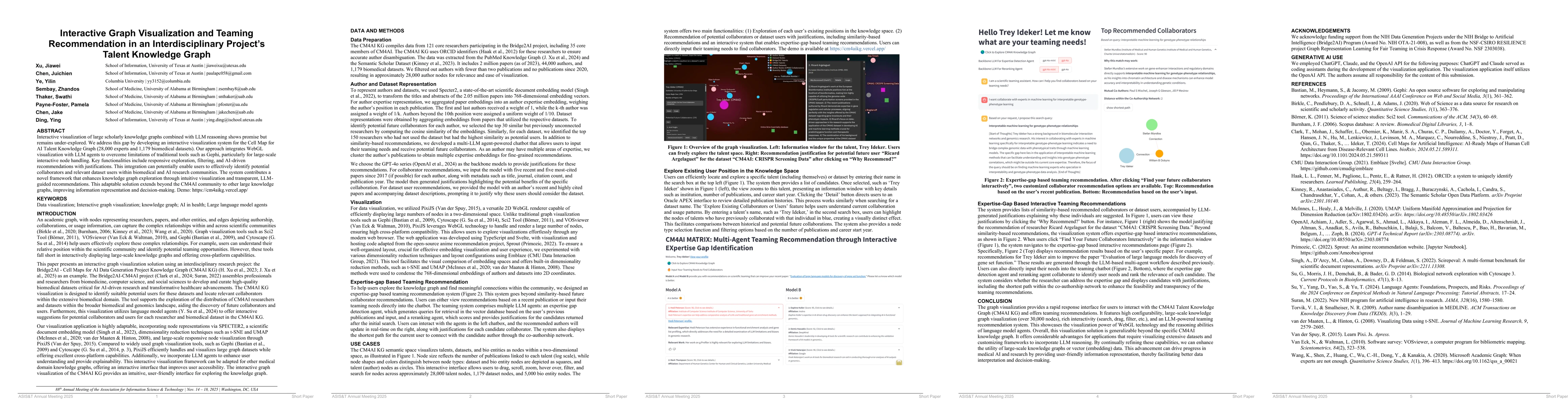 Interactive visualization of large scholarly knowledge graphs combined with LLM reasoning shows promise butremains under-explored. We address this gap by developing an interactive visualization system for the Cell Map forAI Talent Knowledge Graph (28,000 experts and 1,179 biomedical datasets). Our approach integrates WebGLvisualization with LLM agents to overcome limitations of traditional tools such as Gephi, particularly for large-scaleinteractive node handling. Key functionalities include responsive exploration, filtering, and AI-drivenrecommendations with justifications. This integration can potentially enable users to effectively identify potentialcollaborators and relevant dataset users within biomedical and AI research communities. The system contributes anovel framework that enhances knowledge graph exploration through intuitive visualization and transparent, LLM-guided recommendations. This adaptable solution extends beyond the CM4AI community to other large knowledgegraphs, improving information representation and decision-making. Demo: https://cm4aikg.vercel.app/