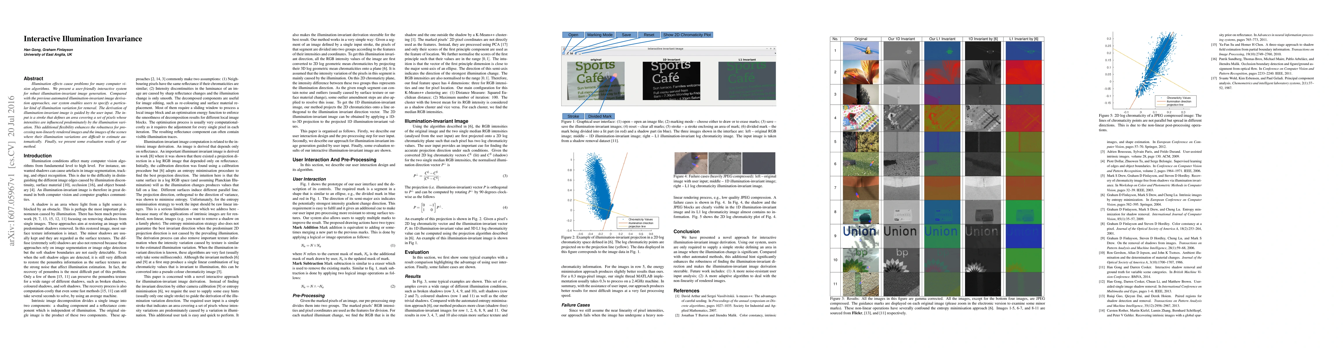 This paper introduces an interactive system for generating illumination-invariant images by allowing users to specify areas influenced by illumination variations. This user-driven approach enhances robustness for complex scenes and non-linearly rendered images compared to automated methods.